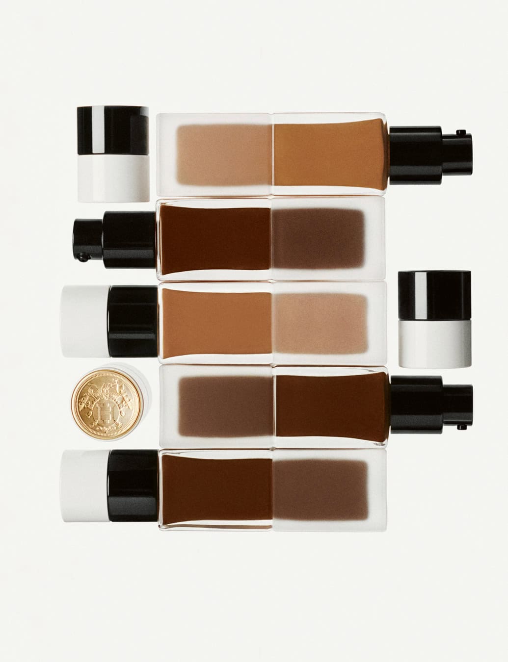 The 34 shades (divided into five colour intensities from light to deep, with cool, neutral and warm undertones) are designed to melt into the skin and bring an ultra-natural, matt luminosity to the face. This inner glow comes from a formula that boasts 82 per cent skincare ingredients. Alongside niacinamide and hyaluronic acid, which gives intense, immediate and long-lasting hydration, is white mulberry tree extract, an ingredient exclusively developed in the Hermès beauty lab. “Its scientific name is morus alba,” says Pyrpylis of this powerful antioxidant, which is present in many Hermès beauty products but appears in a higher percentage in the foundation. “It will help plump the skin and make it more bouncy,” he says. To accompany the foundation and build the ideal, nourished base layer, Pyrpylis has also introduced a 92 per cent skincare-rich perfecting primer that he says finesses the skin so well it can be worn on its own or as a base for the foundation.