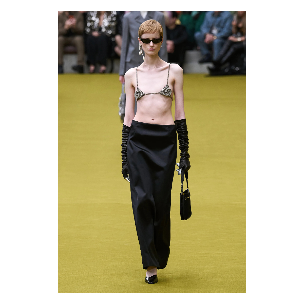We are calling it The Transition collection - the step in between two designers. Our beloved Gucci girl rolled out from the lift doors that opened on three sides to reveal her new wardrobe and attitude. We think we would find her doing the walk of shame with honour. She stays out late and still rocks up to work to looking good. She was harder than last seasons twins and carrying the new reincarnation of the mega Horsebit bag made fabulous by Tom Ford. As is running rich this season - lingerie pieces underpinned the looks and faux fur was shrugged on. With a great lineup of models, including Guinevere Van Seenus in the final look, it was less OTT vintage, yet still vintage. Less, but hard to shake off Alessandro Michele’s legacy too lightly. Gucci are in a holding pattern for Sabato de Sarno who takes up the role of creative director, presenting his first collection next September. As the finale finished, the design studio emerged to take a bow, and A$AP Rocky, Florence Welch, Dakota Johnson and the celeb-deep front row cheered, still committed to the cause.