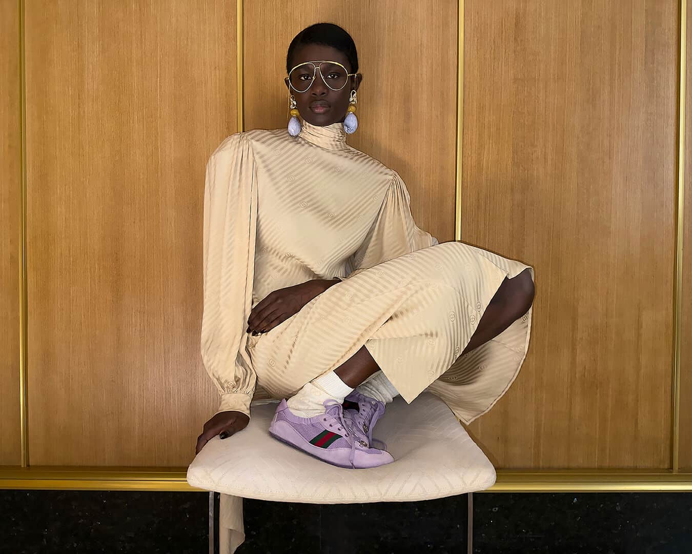 For women, the design blends GG mesh and soft suede, cut through with elastic inserts for that deconstructed, ultra-light feel. The sole nods to the elegance of a ballet flat – slim, refined, yet firmly in athletic territory. Details matter here: a glinting gold Interlocking G charm on the laces, the Web loop at the back and colourways in suede, technical fabrics and GG canvas neutrals.