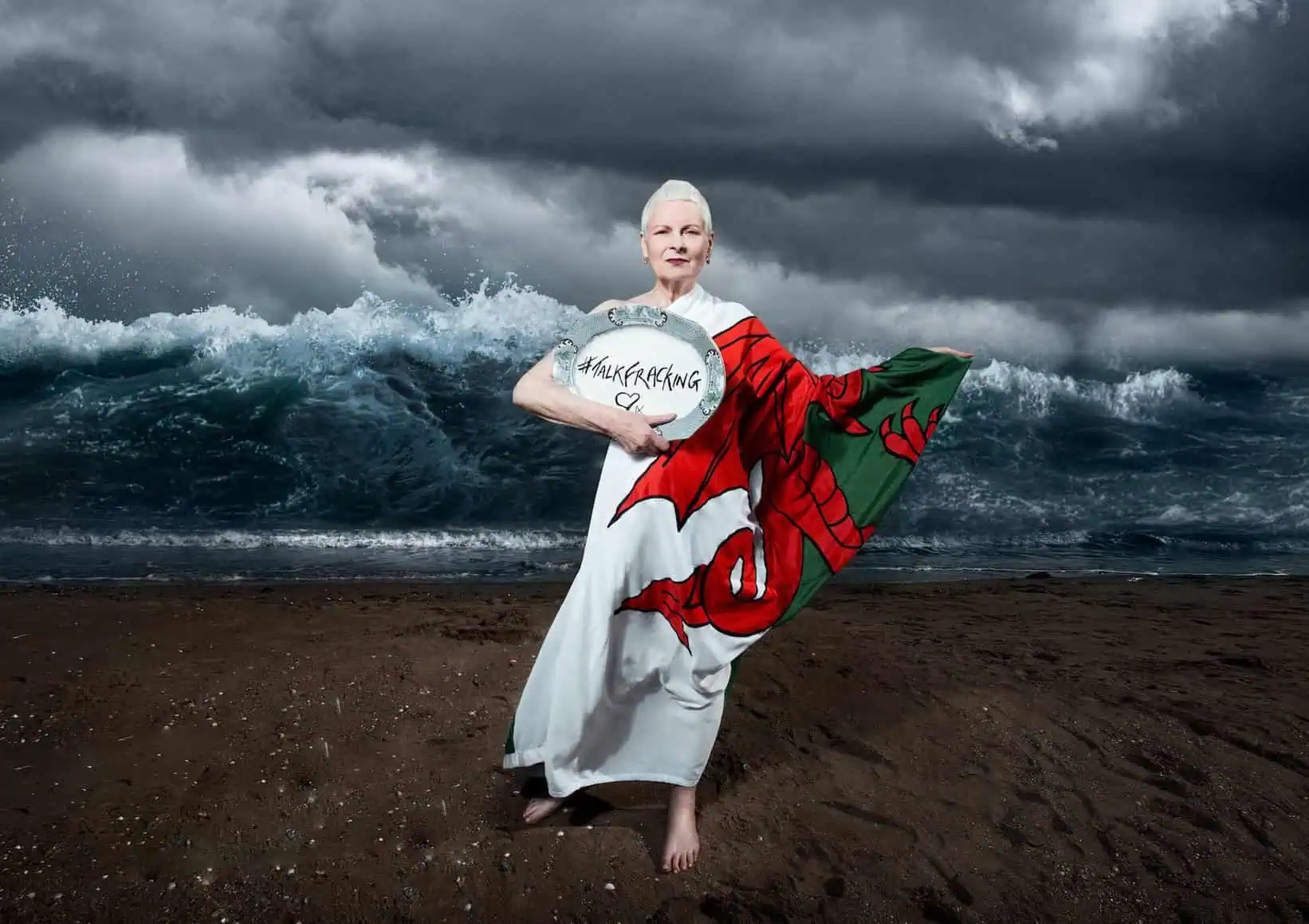 Perhaps the most arresting image in the exhibition was made on that tour, on the Gower Peninsula in Swansea. Westwood stands on the beach draped in nothing but a Welsh flag, a “Talk Fracking” plate held like a shield, the sea pushing in behind her. Price had long wanted to photograph her nude, inspired by Juergen Teller’s bath portrait, but reframed through activism. “I’d wanted to shoot Vivienne naked… but I wanted it the way of activism.” He proposed it; PR advised him to ask Corré. “You can imagine the scenario of going to speak to Joe and saying, “Joe, can I shoot your mum naked or something… and on the beach”, you know?”