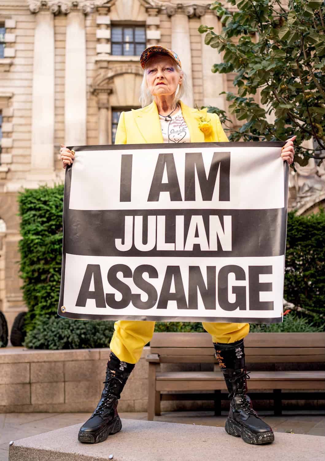 Power also pulses through the image of Westwood at the Old Bailey in 2020, dressed as a canary in a cage in support of Julian Assange. Price prefers the portrait made moments later, outside the cage, the “I am Julian Assange” sign legible. “I wanted to get that sign in,” he explains. The composition mattered, but the message mattered more.