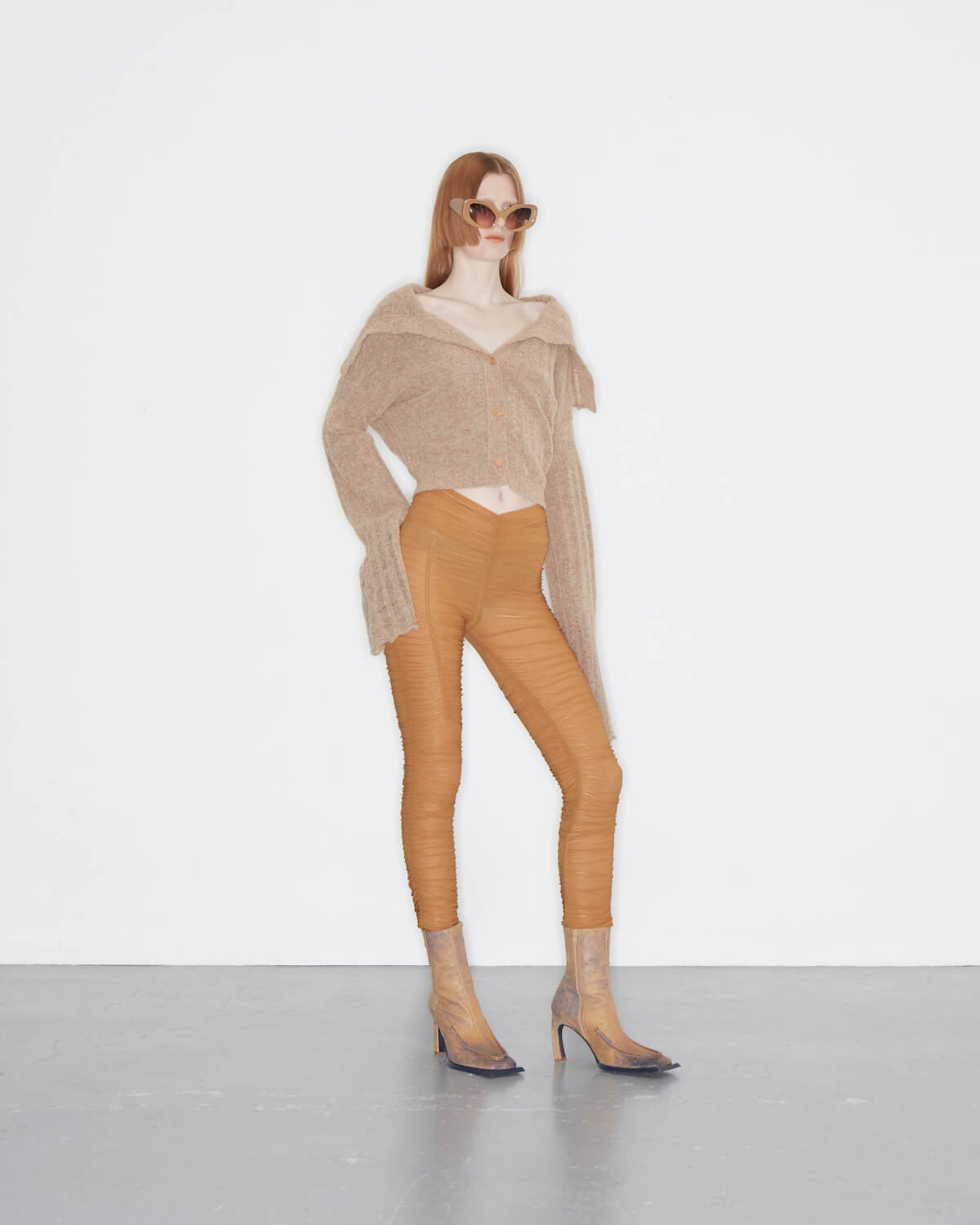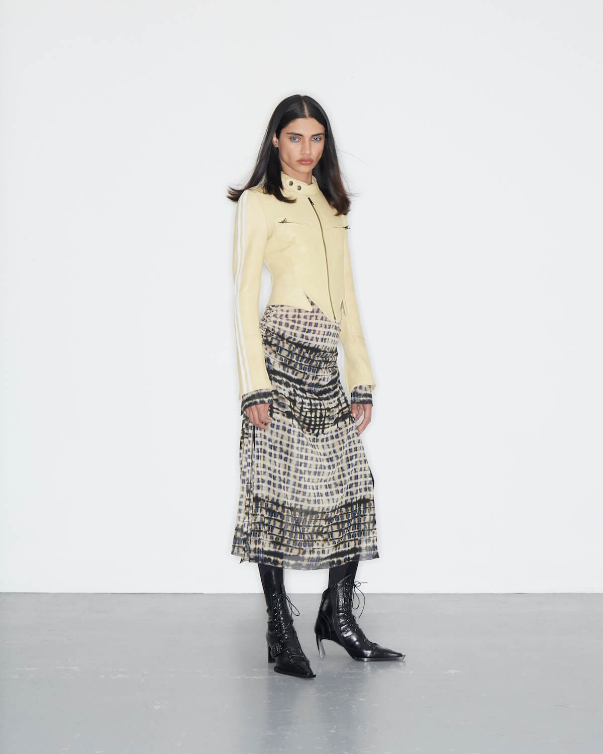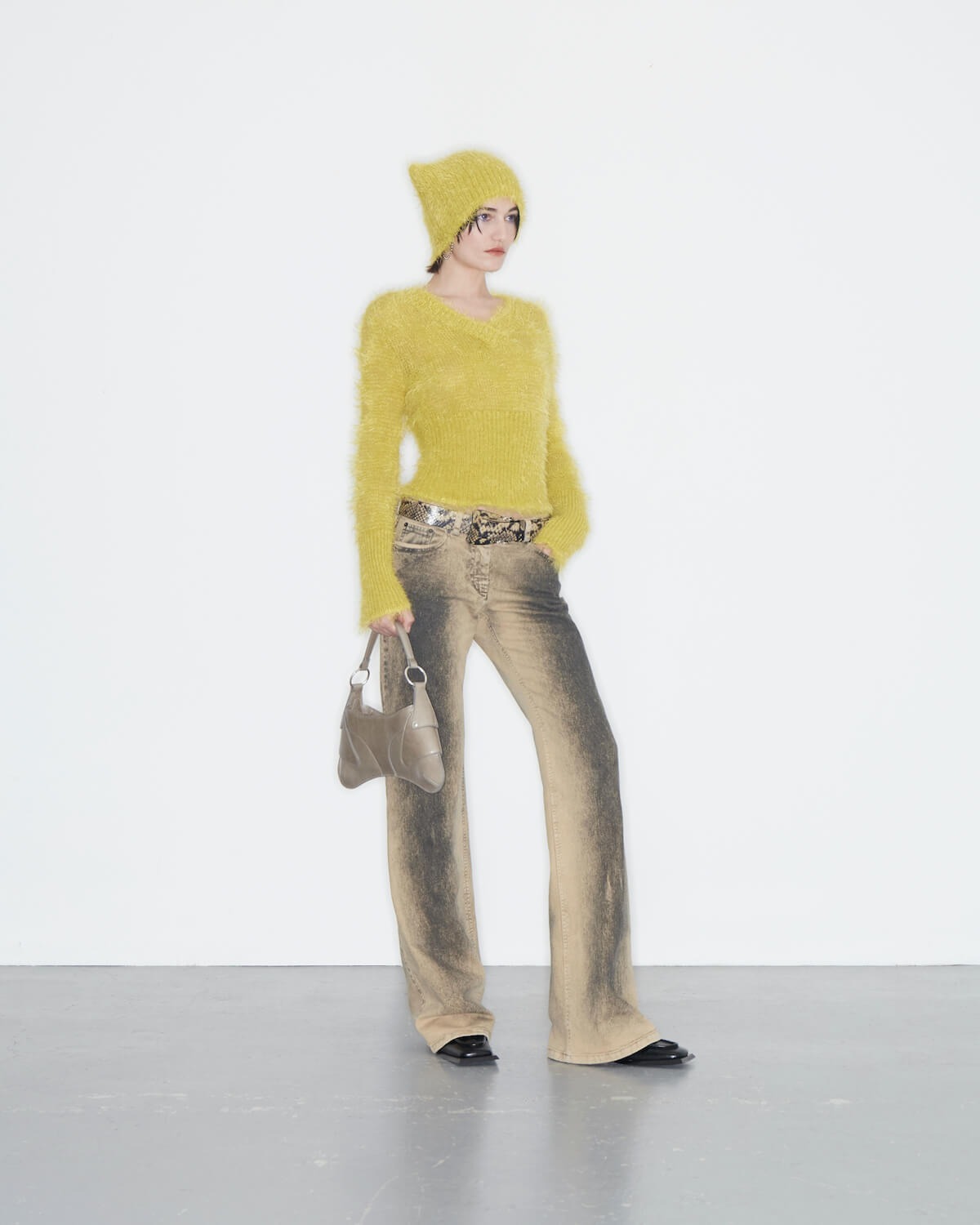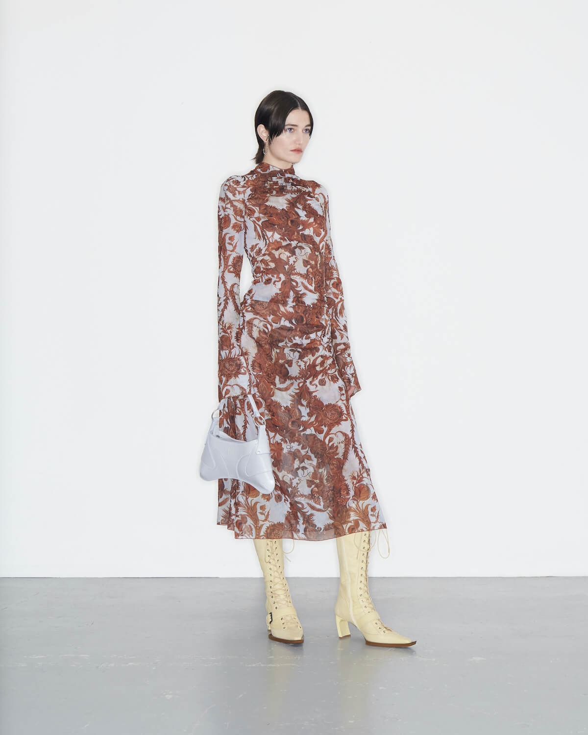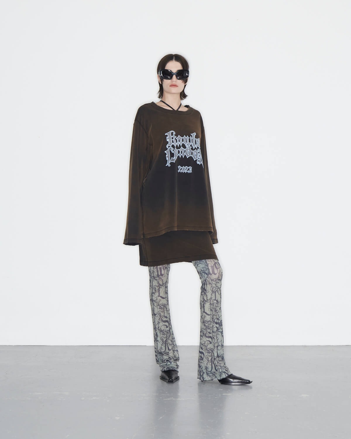 KNWLS is making a whole lotta’ noise with its AW23 offering; an electric collection fit for a femme fatale. Aptly named Noise, it’s a more mature range than what we’ve seen before from creative director duo Charlotte Knowles and Alexandre Arsenault, whose usual opus is reserved only for the slickest of provocateurs. It’s a touch more tempered and demure, but don’t fret, Noise certainly isn’t for the faint of heart either: it’s utilitarian and provocative, hitting that It-girl note right in its sweet spot. Slick reptilian separates and croc embossed co-ords are underscored by oversized cybergoth knits and ruched chiffon leggings, bringing in an air of dangerous femininity. Graphic mesh gowns are printed with defensive fauna – prickly burrs that sprout from serrated vines. Fluffy mohair knit dresses evoke modern day flapper-core in a shaggy brushed black knit fabric and fraternise with second-skin long-sleeve tees, enveloping the body like gentle armour. Two-tone washed leather trench coats are belted and corset-cut moto jackets are disrupted by ferocious matching micro minis. A fuzzy lemon-yellow v-neck knit with its matching kawaii-style cat-ear beanie never looked so lush.