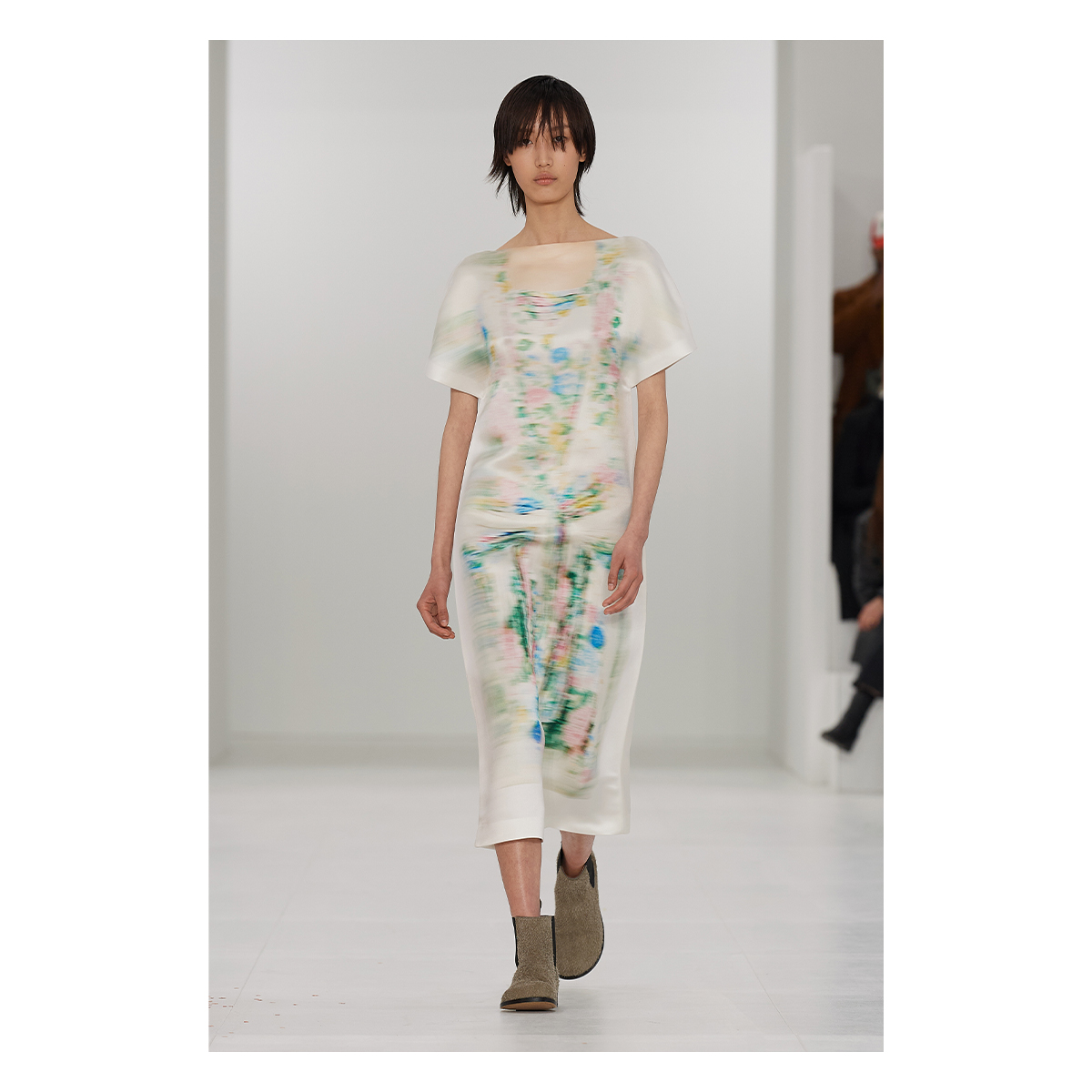 His models, walking gracefully between cubes of compressed confetti (courtesy of the artist Lara Favaretto) in a huge tent in the grounds of Chateau Vancines, expressed something calmer. Simple, loose silk shifts were printed with tromp l’oeil impressions of dresses, rain macs or fur coats. Others came in watery prints that looked like faded photocopies of a once vibrant floral. Imperfection became a detail. A cardigan was printed with deep creases. Intimacy was also on the agenda as were the gestures we make with our clothes. Silk gowns came with cloaks attached that had to be clutched tight, or had trailing trains that needed to be hugged close to the body by the models. Oversized coats (one glinting all over with coal coloured sequins) and supersized shoppers were the chic stand-outs in a collection full of covetable clothes. We’ve come to expect the zing of something eccentric from Loewe and JW Anderson didn’t disappoint with vinyl lampshade dresses and fully feather trousers worn with matching tees.
