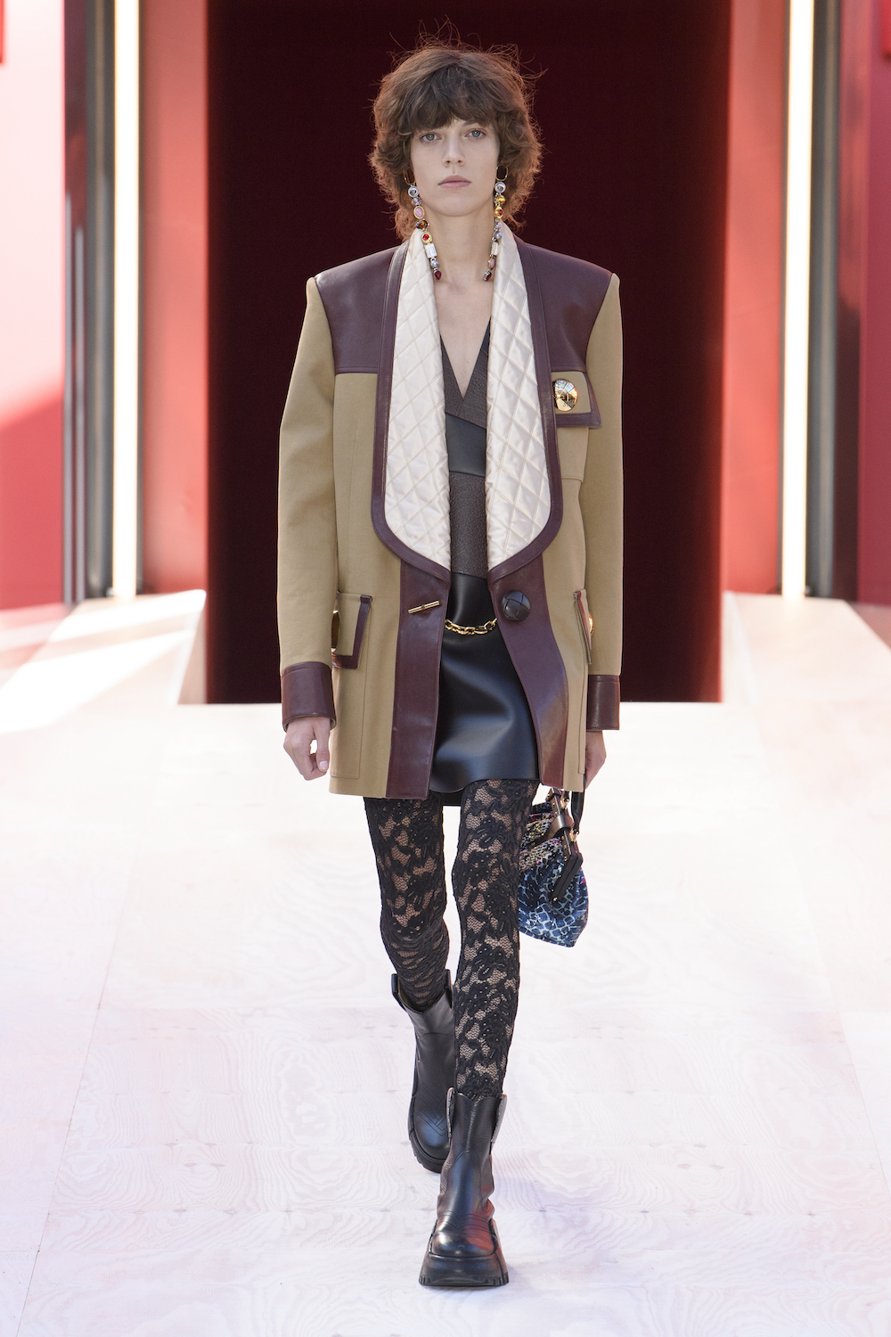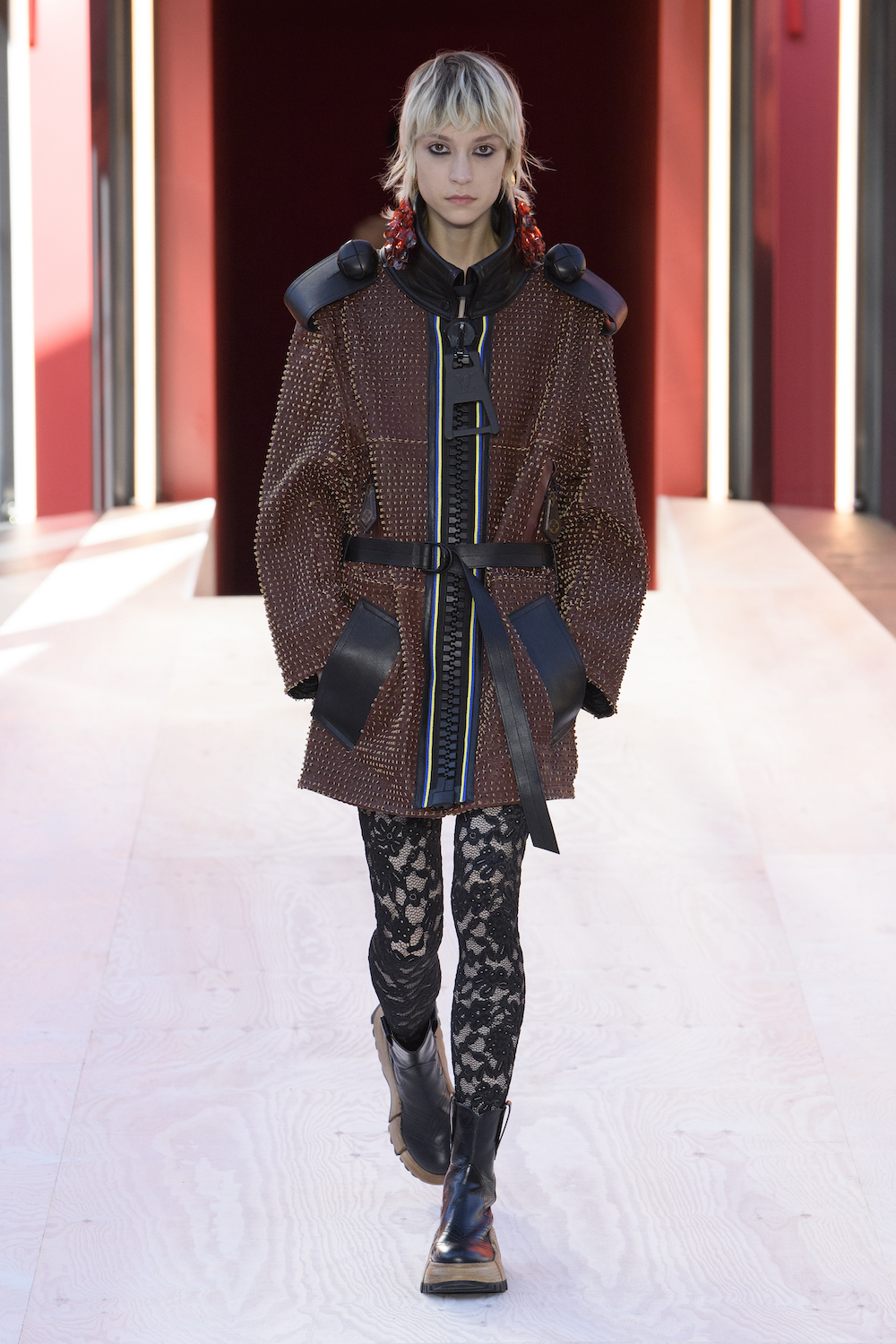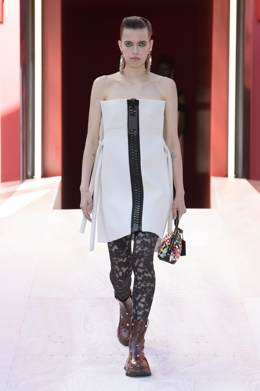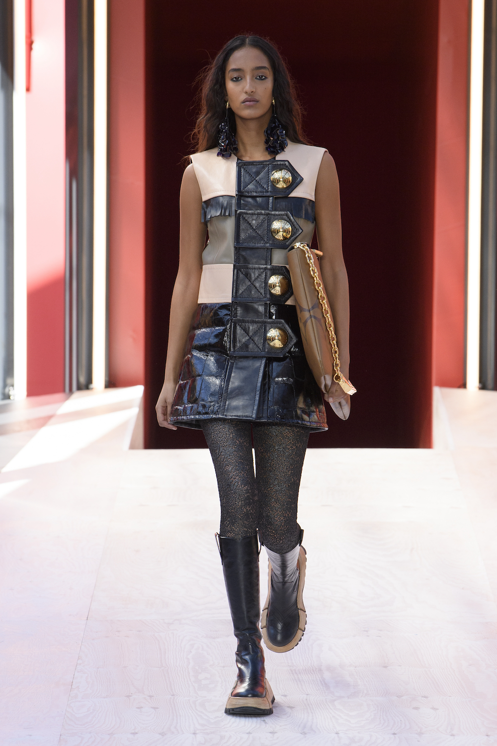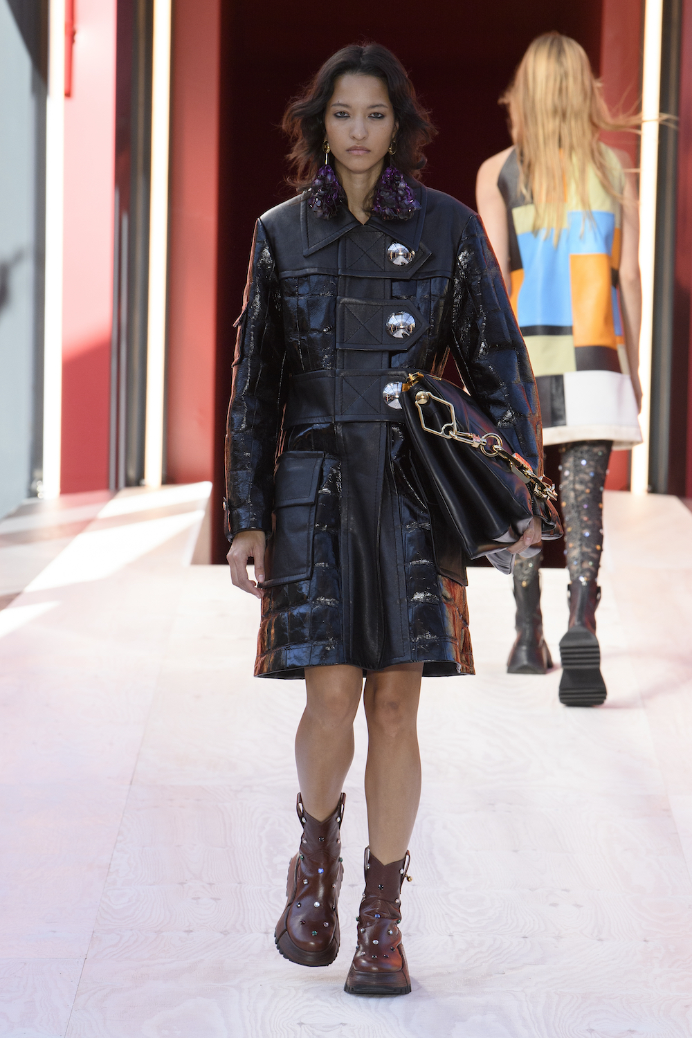 The infinitely large and infinitely small came together at Louis Vuitton in a madcap game of proportion that would have made Klaus Oldenburg proud. Nicolas Ghesquière zoomed in on the small details of clothes and bags, supersizing them and placing them on clothes, to startling effect. Giant zippers, supersized grommets, press studs, the corner of a trunk, labels (all the signifiers of the brand) adorned everything from little A-line dresses to leather jerkins and coats. One dress had macro versions of the lock and chains of a Vuitton bag in lieu of shoulder straps. Details of leather straps and buckles – blown up onto prints on perforated leather suits and little leather trimmed halter tops – looked like upside down duffel bags complete with draws strings and straps. Meanwhile, bags were treated to a reverse perspective. Luggage tags were blown up to shopper-size, and pocket chain wallets were magnified into portfolio-sized clutch bags.