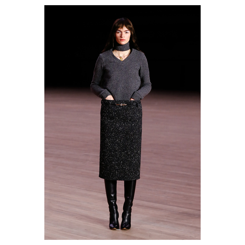 Given the extensive annotations, the collection was not mired in the past. Opening with a somber grey sweater tucked into a sculptural pencil skirt worn with knee high boots, it was a nod to ’90s minimalism that felt equally as relevant today. A zip-up jacket with a low waisted skirt on Alex Consani nodded to modern trends, yet felt as if they were the perfect lovechild between Marc and Miuccia. From there grungy plaids rendered into matching sets gave the motif a grown up urgency – you could imagine the Gen X woman and her Gen Z daughter sharing these pieces happily.