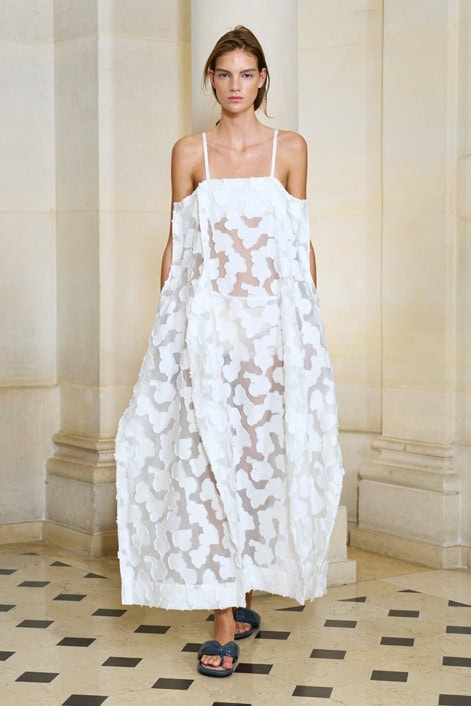 In a season of attention-grabbing debuts, Mark Howard Thomas, design director at Carven, took a different tack. For his first show at this storied French house, the talented British designer wanted to express something intimate. “We were aware that other very big houses would be making a lot of noise that season, so it was intentional to create something that felt more calm, more considered,” he says of his decision to show the collection at the brand’s home on the Champs-Élysées. That idea of home and intimacy was at the forefront of his design choices too, with clothes inspired by linens and tablecloths.