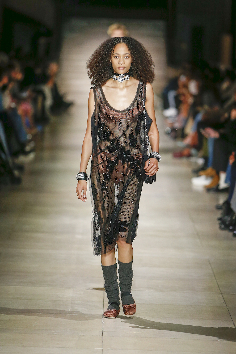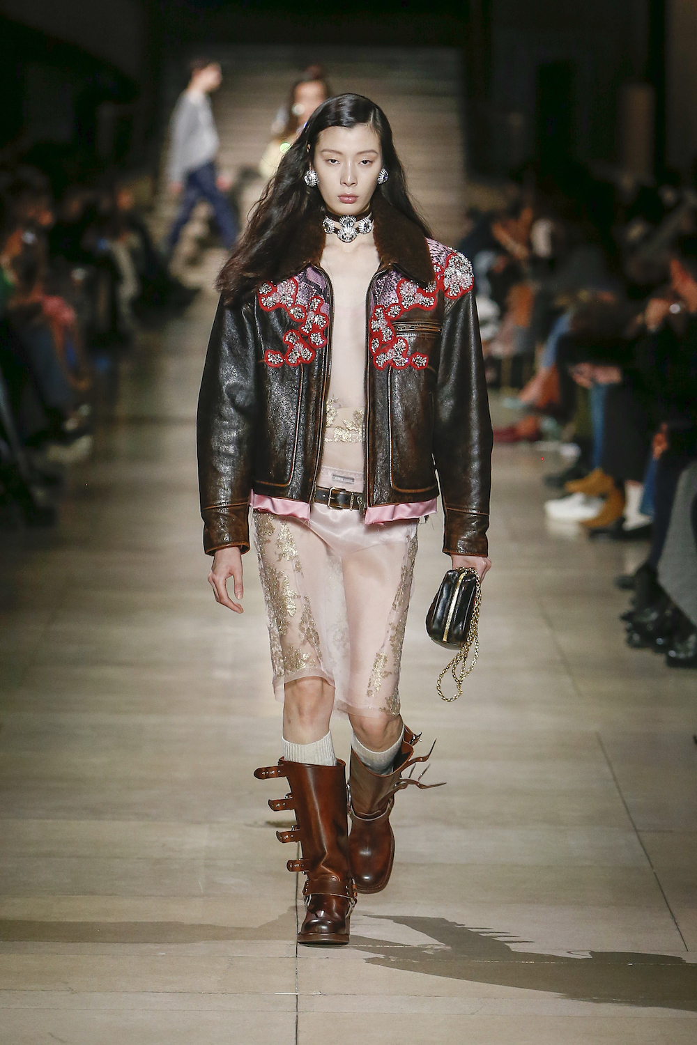 Flick through any magazine or street-style feed and there’s no getting away from the Miu Miu mini skirt. Impossibly short, daringly low slung and deliciously Y2K, this belt-length skirt is the piece that stole the season. Miu Miu is not ready to give up on this mega-hit item just yet. For AW22, it morphed into a teeny-tiny tennis skirt worn so low you could see the waistbands of the models silk knickers. Tights? They are for wimps. This look demands lashings of bare leg, although Miuccia Prada did allow some models to cover up in roomy mannish coats and shearling jackets. Both those items are Miu Miu staples and the house found other ways to remind us of what it does best. If you are in the market for a crystal-strewn party dress Miu Miu has them and remember those ballet shoes that everyone went crazy for a few seasons ago? They’re back too, in white satin.
