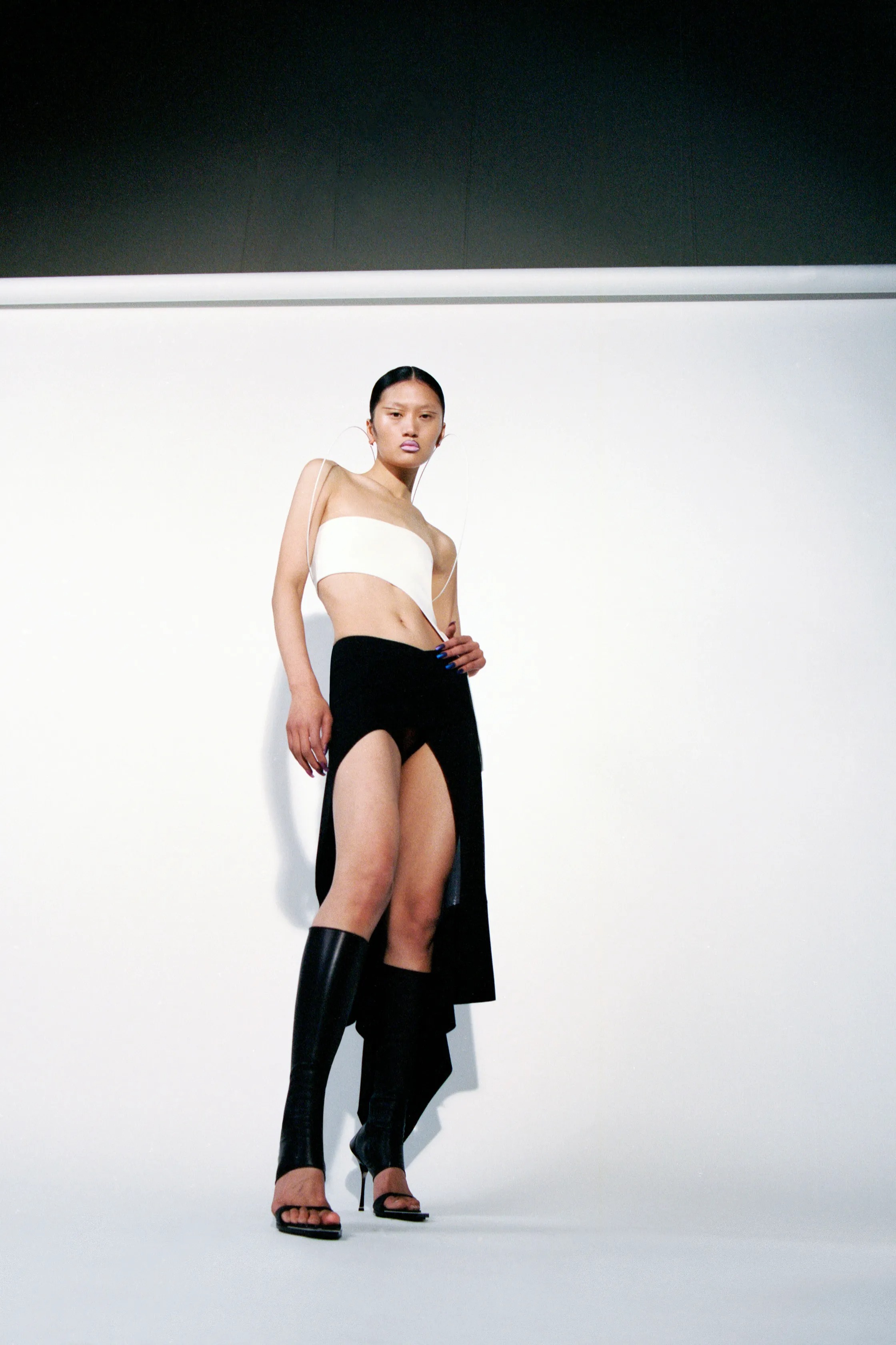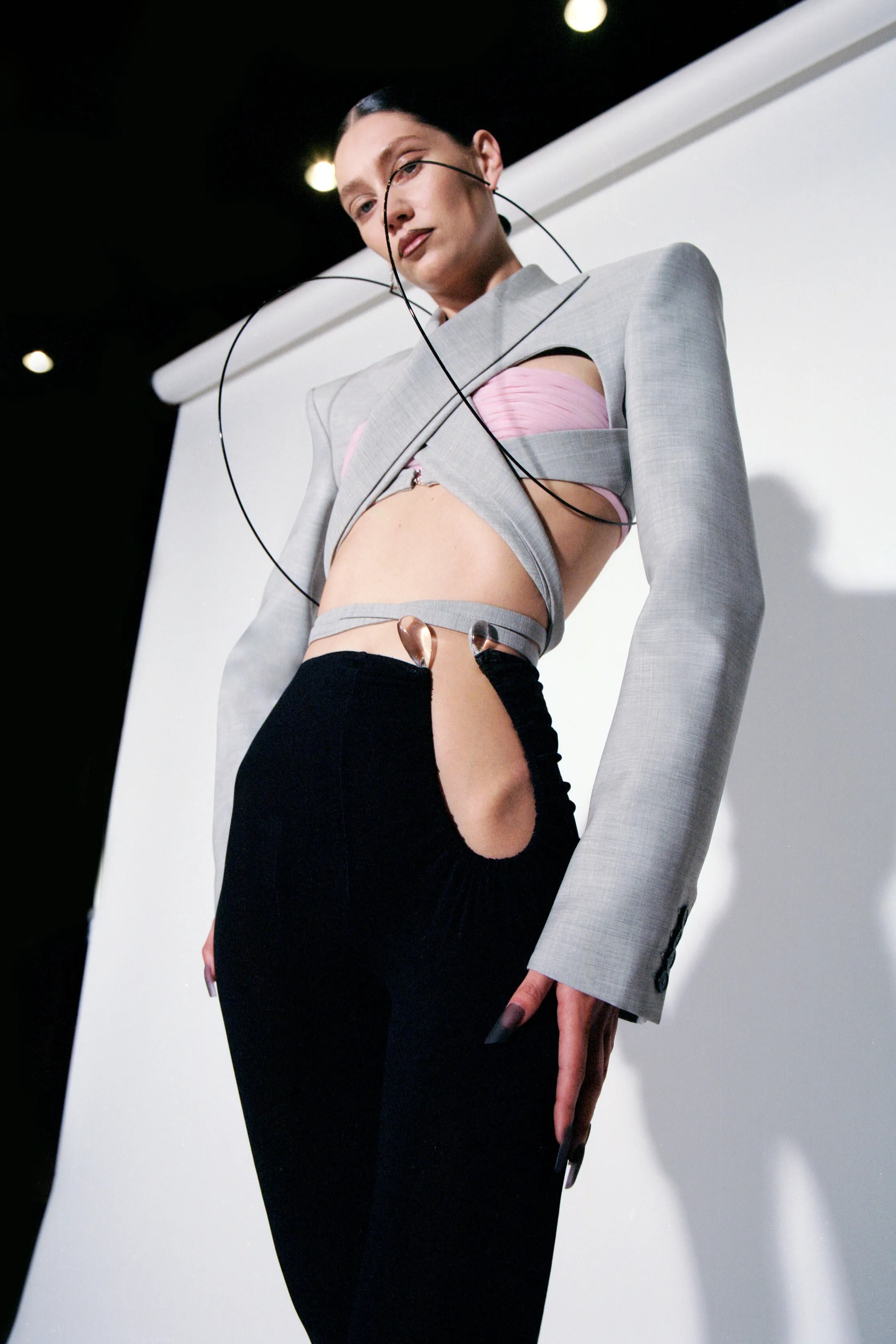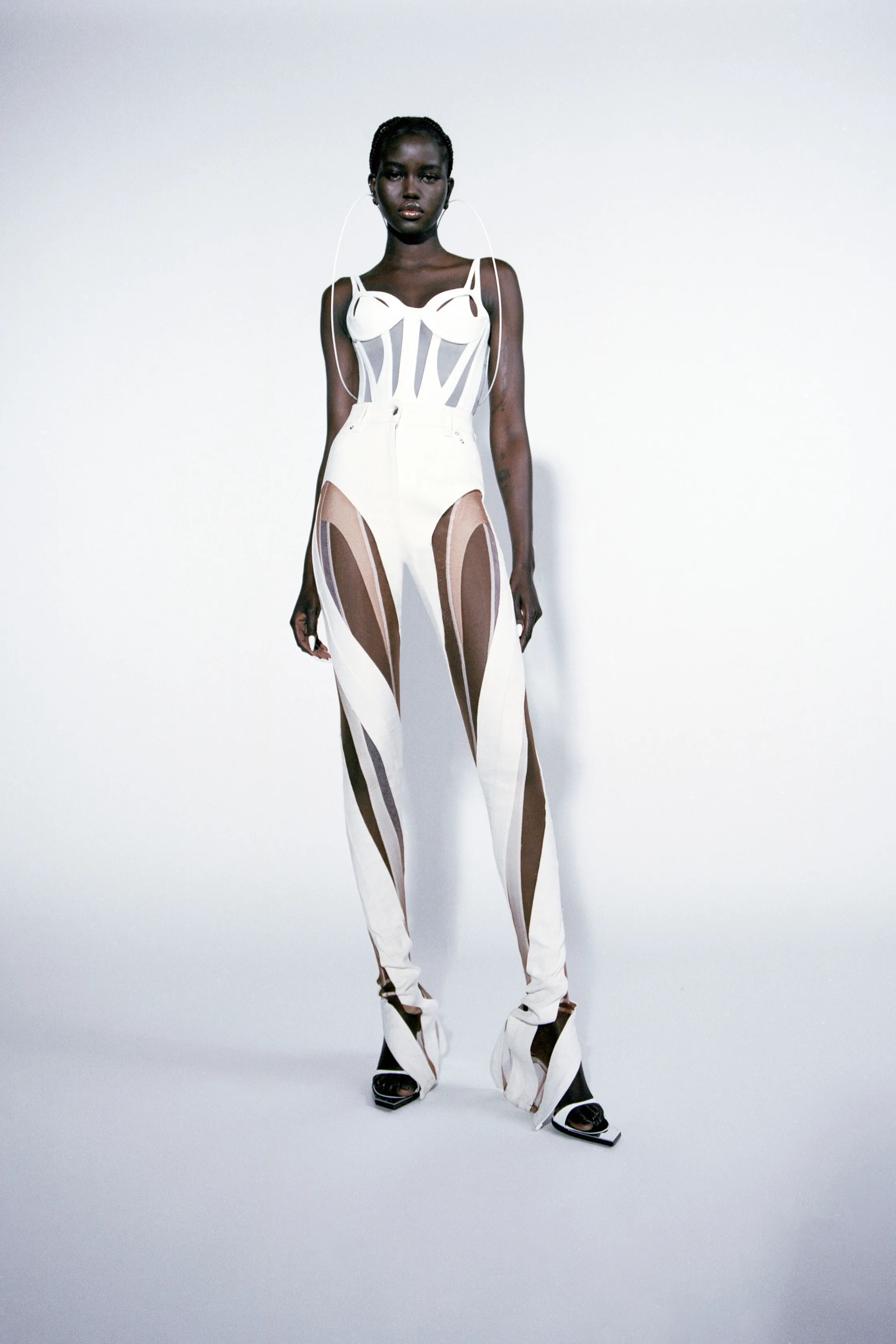Throughout, both Mugler and Cadwallader signatures get a touch up. The brand’s hit illusion bodysuits now come in rave-ready hues: flashes of orchid pinks and purples, vermillion, and coral, spread across razor-sharp cuts. Perspex hardware – a Manfred Mugler classic – also features across sculpted shirts and trousers, paired alongside XXL hoop earrings and Cadwallader’s newest creation: the Hoochie dress, a gloved, asymmetric frock with plenty of cut-outs – offering glimpses of erogenous zones. No one does sexy dressing quite like Mugler.
