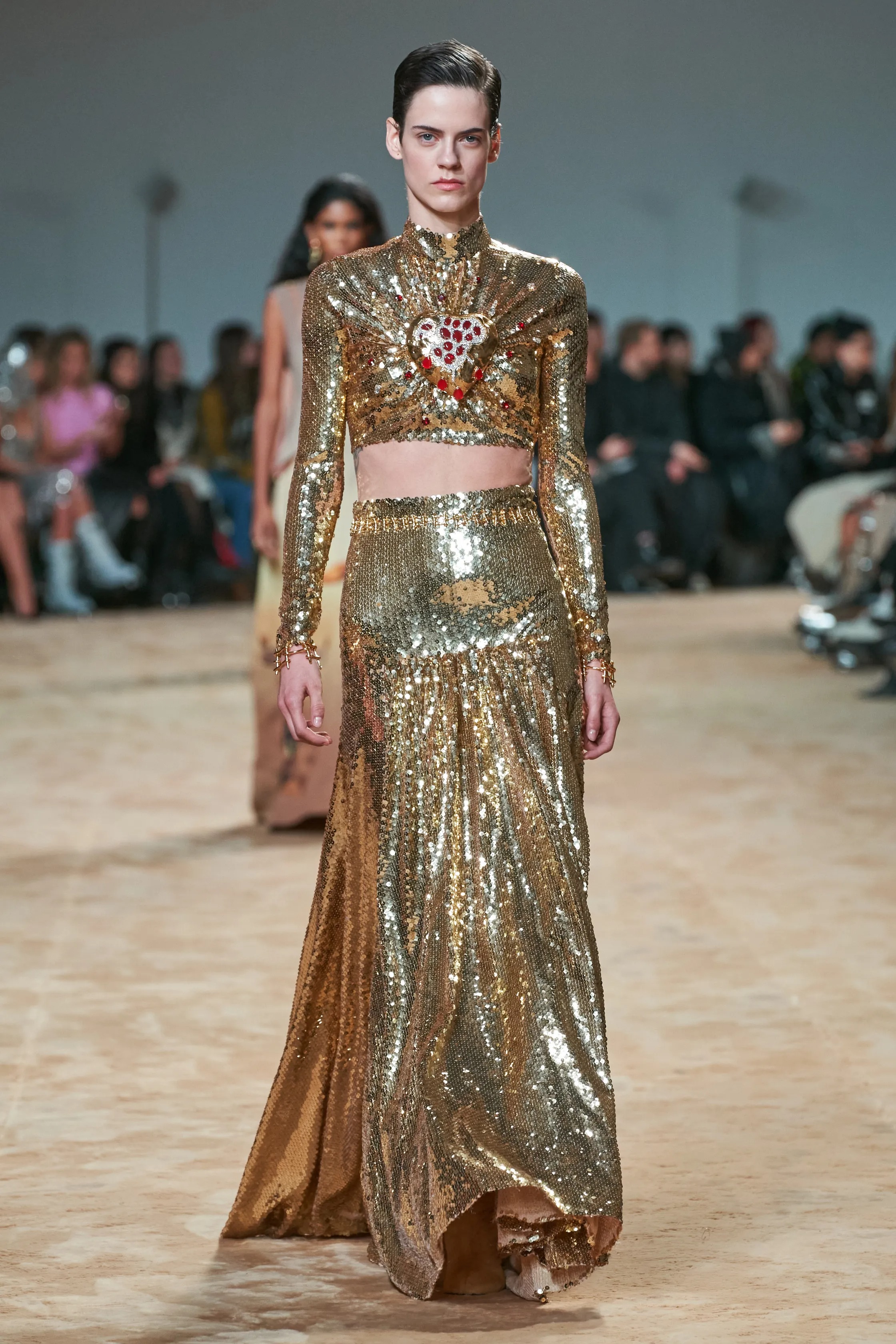 The rustling procession of showstoppers was topped off with five linked disc dresses pulled from the brand’s archive, which shined just as bright today. It proved a fitting salute to a fashion architect with an eye always on tomorrow.