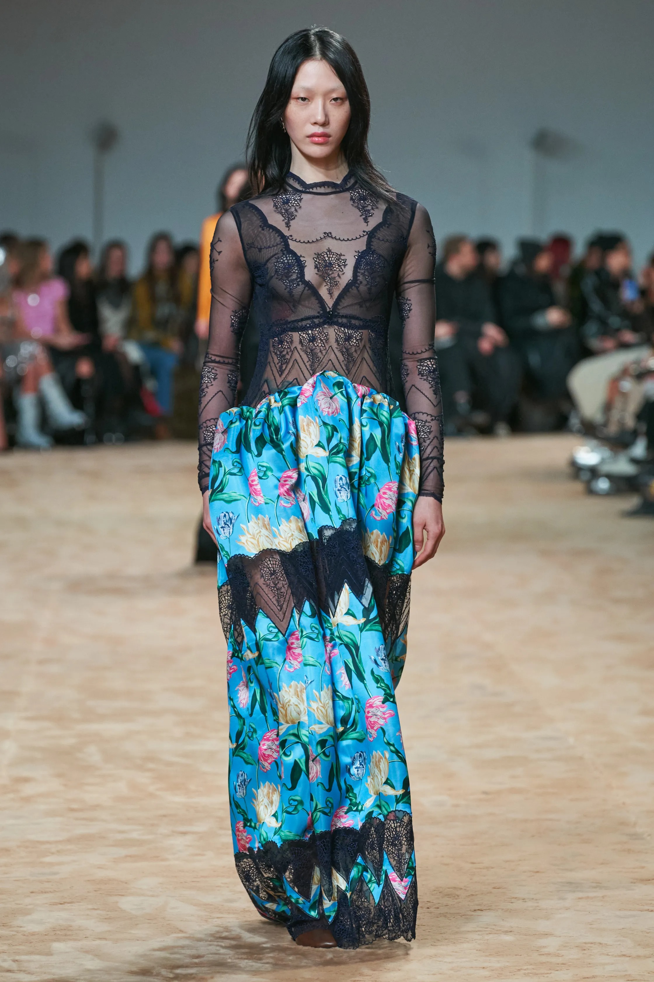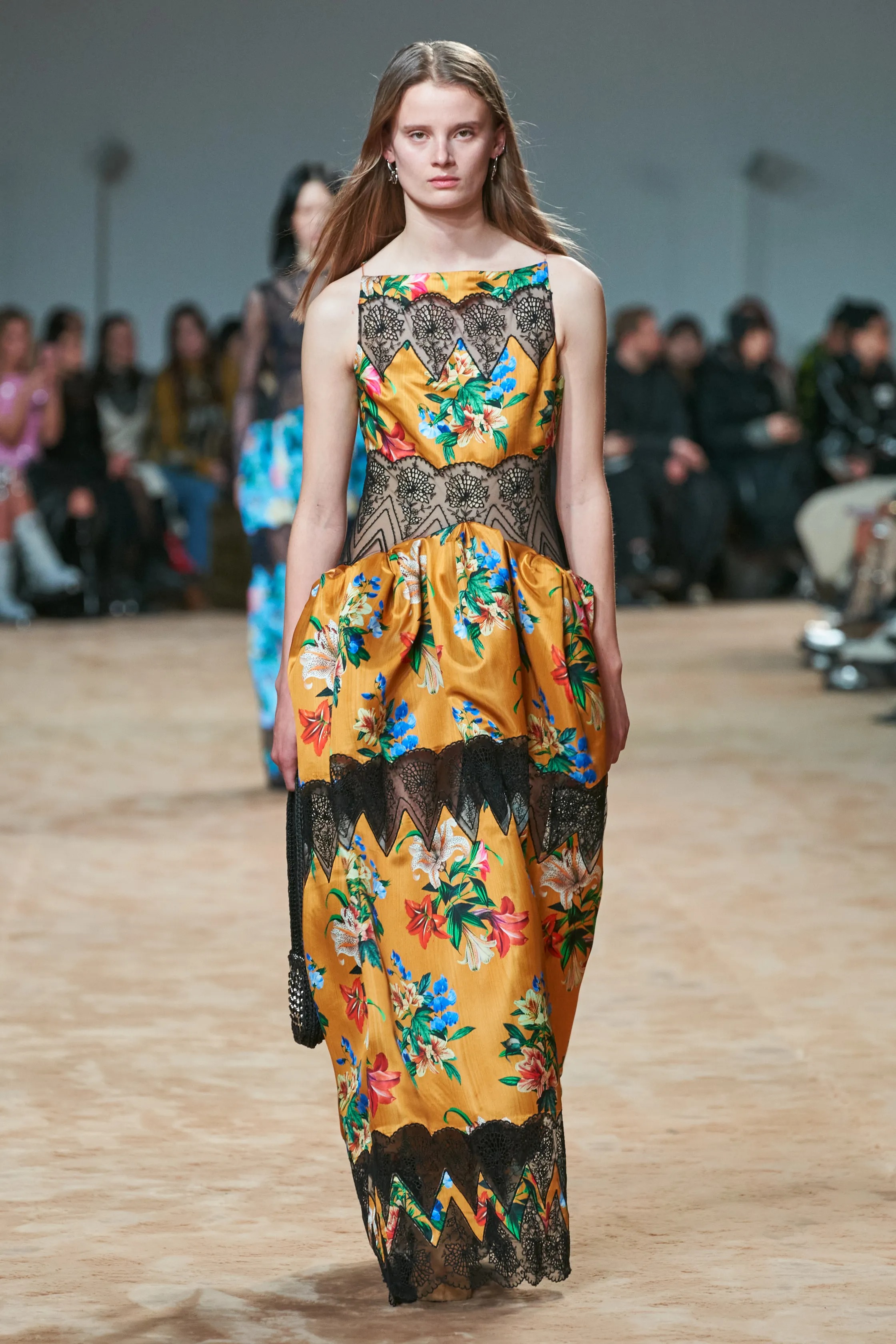 In paying tribute to Rabanne, Dossena charged forward with the brand’s use of divisive fabrics. Hairy wool was brushed out to look like fur, and clear crystals resembling ice cubes, cascaded from column dresses. Rabanne’s friendship with fellow Spanish visionary, Salvador Dalí, was also celebrated, via a series of evening gowns stamped with four of the artist’s paintings, including “Sun-Table (1935)”.