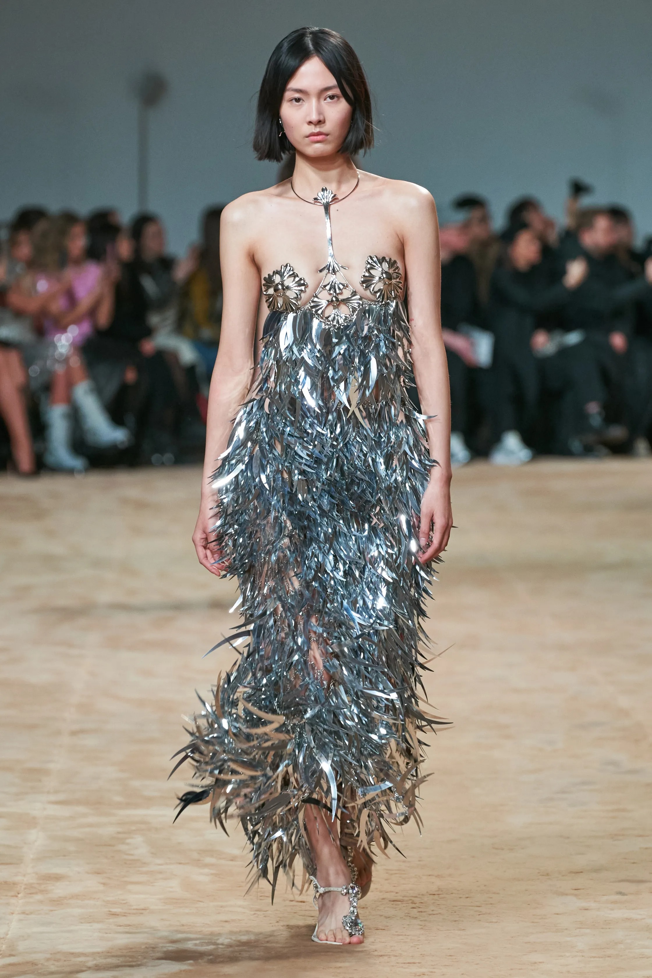 You could hear Julien Dossena’s Paco Rabanne frocks before you could see them. A parade of shiny, assemblage dresses jangled like tambourines as they sauntered by. Their chainmail, plastic and metallic feather constructions honoured the house’s founder, who passed away February 3. In the 1960s, Rabanne’s future-facing designs changed the way we thought about fashion. Dossena, too an innovator, has spent the last decade funnelling the late designer’s revolutionary approach to craft through a deeply modern wardrobe, one equipped to dress forward-thinkers of today.