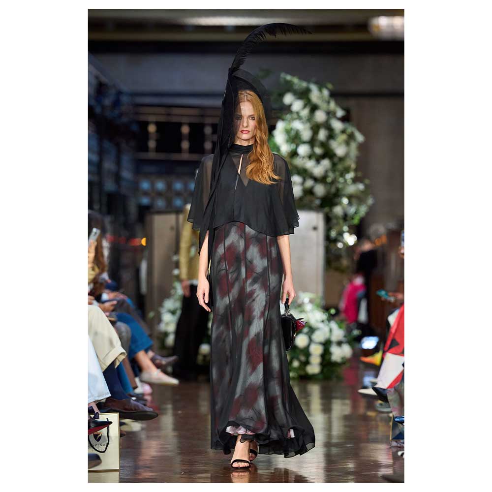 The collection was in tribute to McDowell’s late grandmother who first taught him how to sew. Titled Lancashire Rose, many dresses came adorned in a fuzzy floral motif, like a snapshot of a meadow caught in motion. Every piece that took to the catwalk will be fully traceable thanks to a Certilogo digital passport (in tribute to his grandmother, McDowell produced a replica of her passport from 1923 for guests to take home).