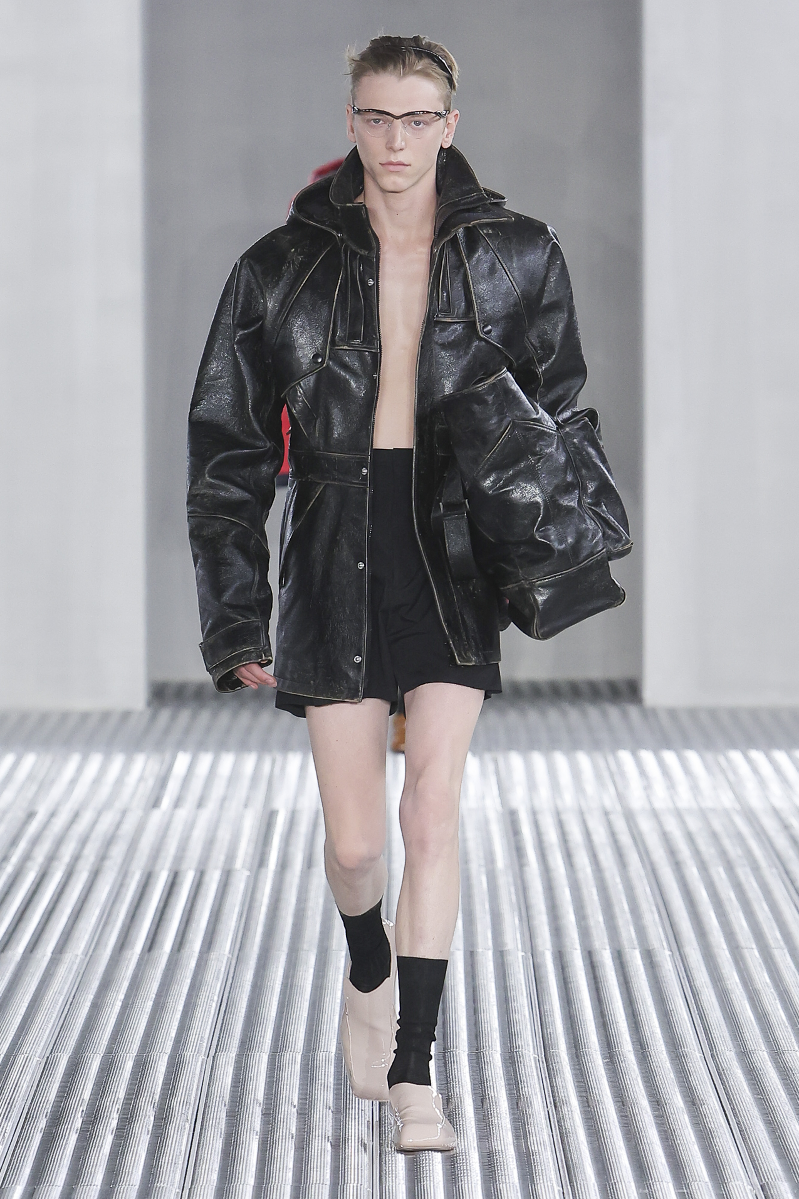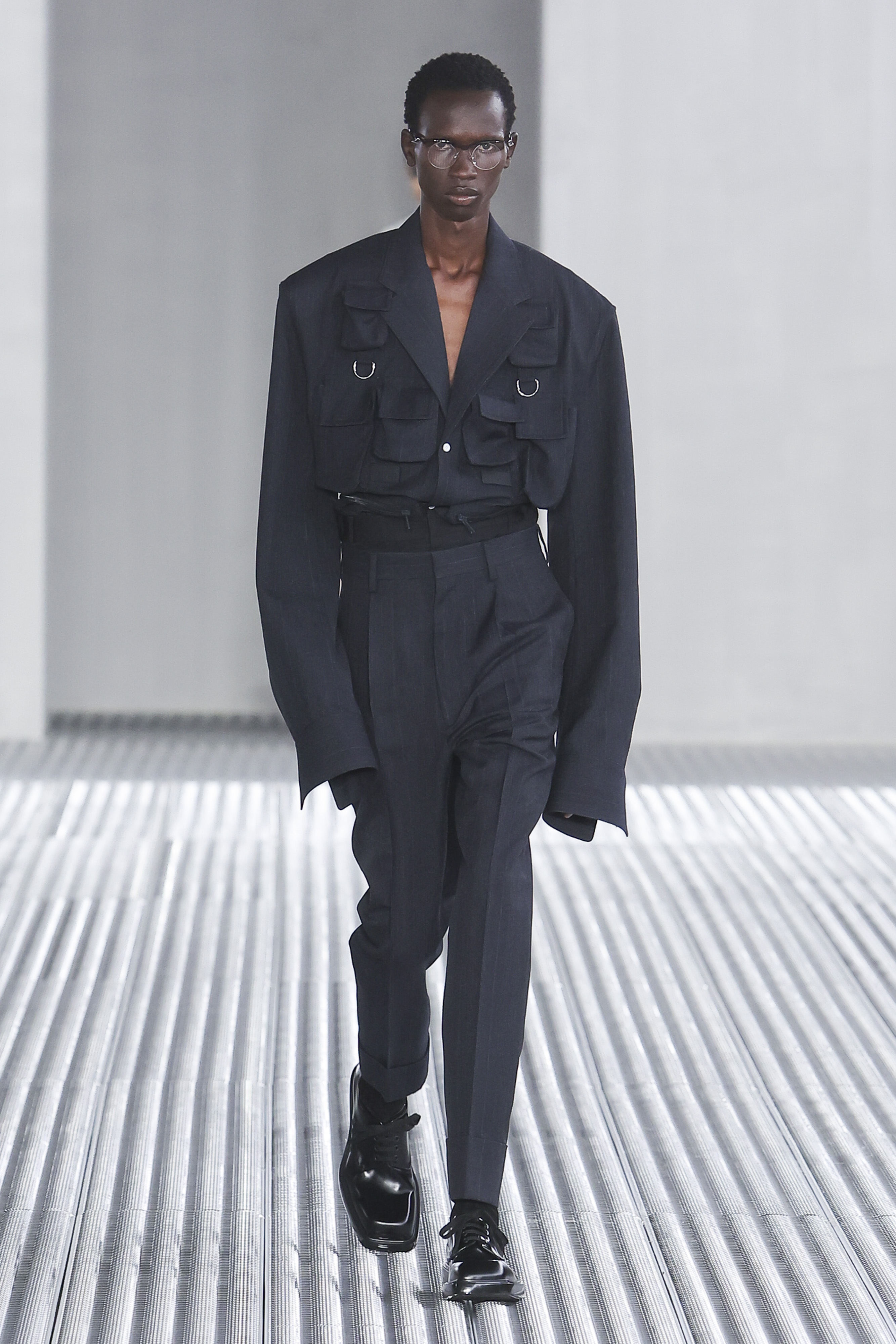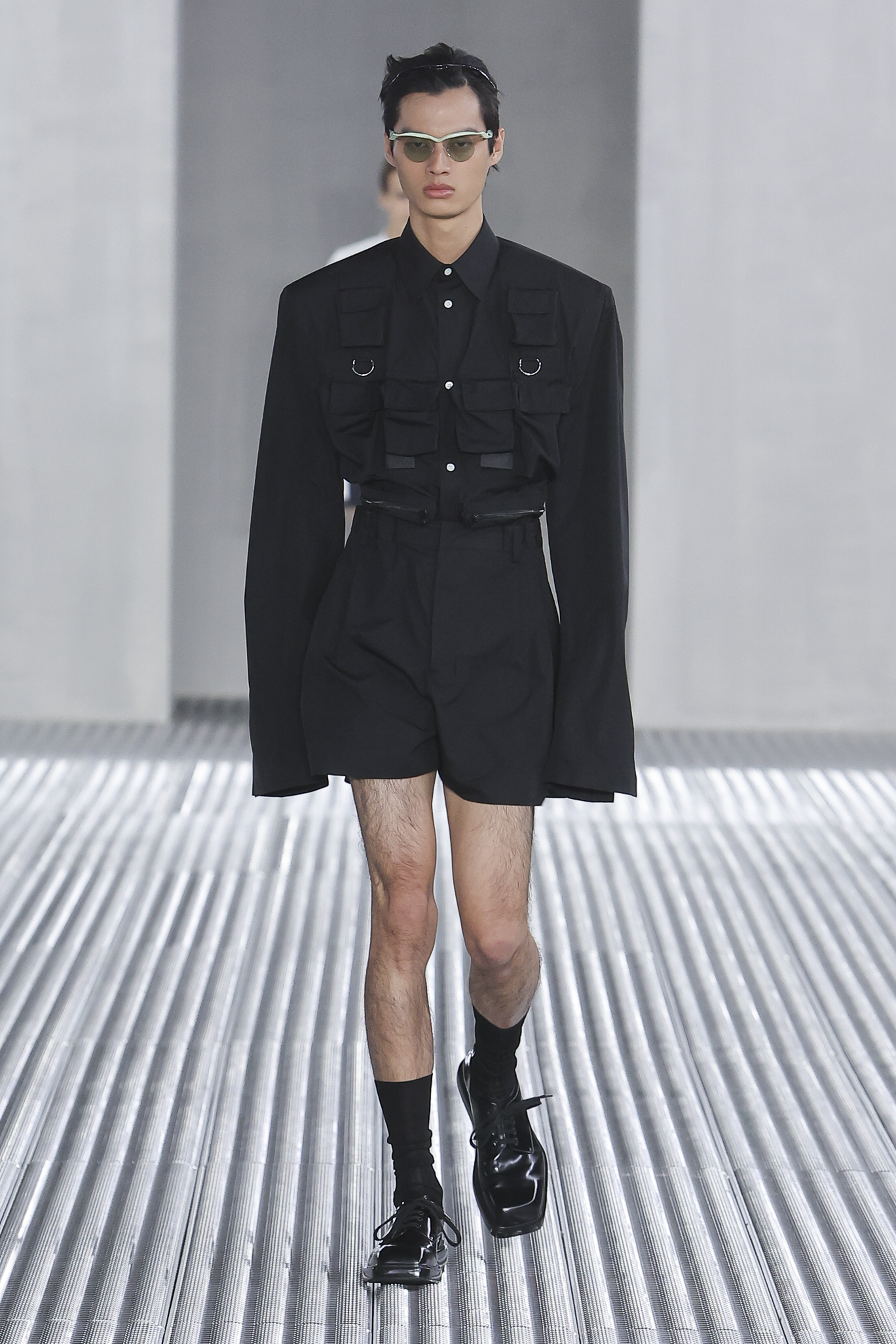 With Fondazione Prada transformed into an industrial steel box, curtains of slime began to ooze from the ceiling, forming toxic green puddles as Nine Inch Nails’ “Closer” flooded the space. The silhouette of a classic dress shirt was the pair’s starting point, proposing tailoring that offered no restriction to the wearer. Boxy at the shoulder, with elongated sleeves and cinched-in waists, the silhouette was recontextualised from the 1940s, when such proportions were favoured for accentuating the male form. Here, the emphasis was on functionality and fluidity. Pastel-hued overcoats were lightweight, denim shirts were cut large and paired with school boy shorts, and gilets came littered with plenty of pockets.