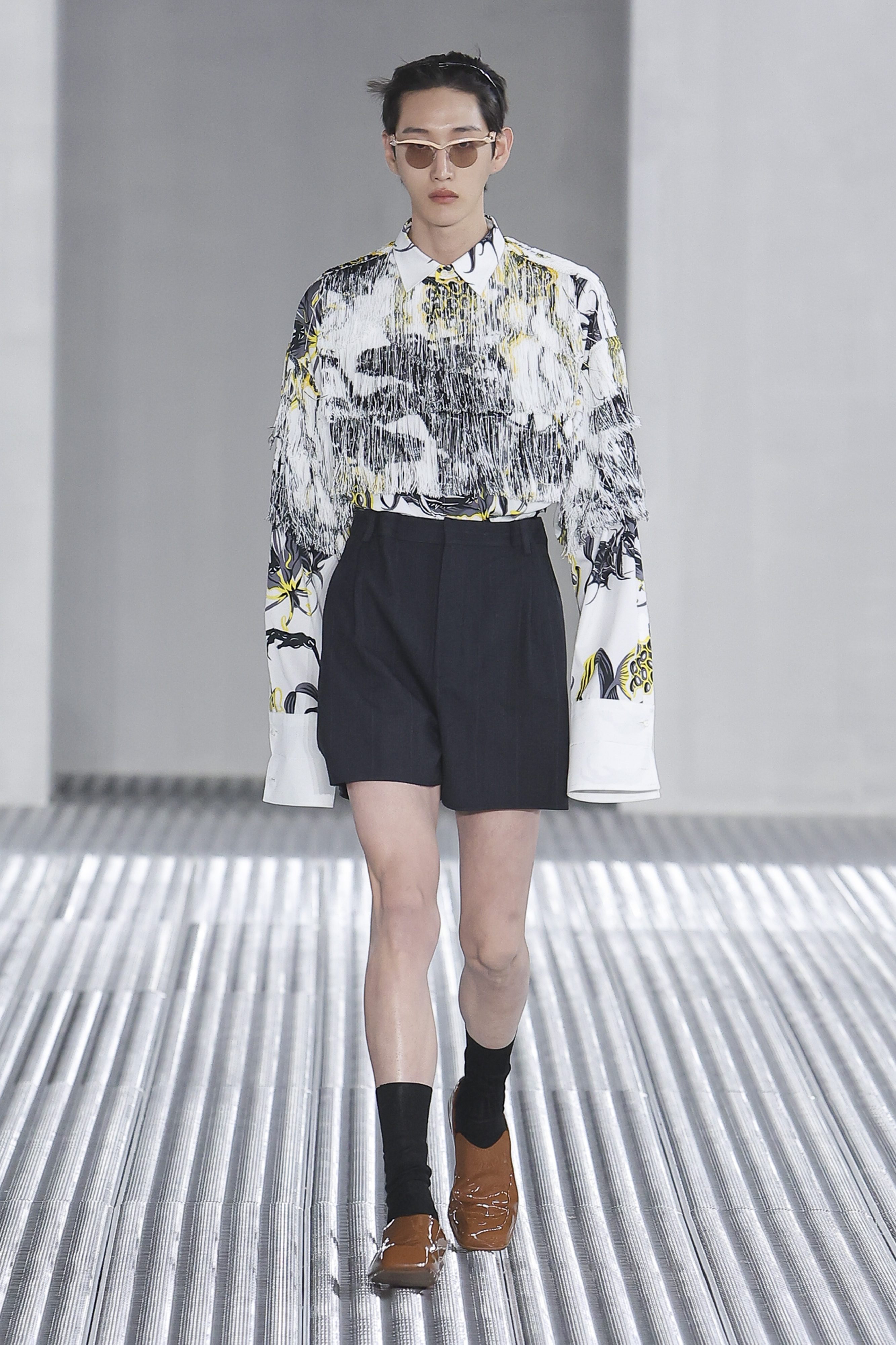 An air of the extraterrestrial underlined the collection. Be it retro-futuristic patent leather loafers or a new, fringed take on the staple Prada Hawaiian shirt, with gruesome aliens now lurking within their florals. There was a playfulness to such pieces, that coupled with the slime, harked back to witty Prada collections of yesteryear. “Life and understanding of life is so complex,” said Mrs. P. “Simplicity can be too simple.”