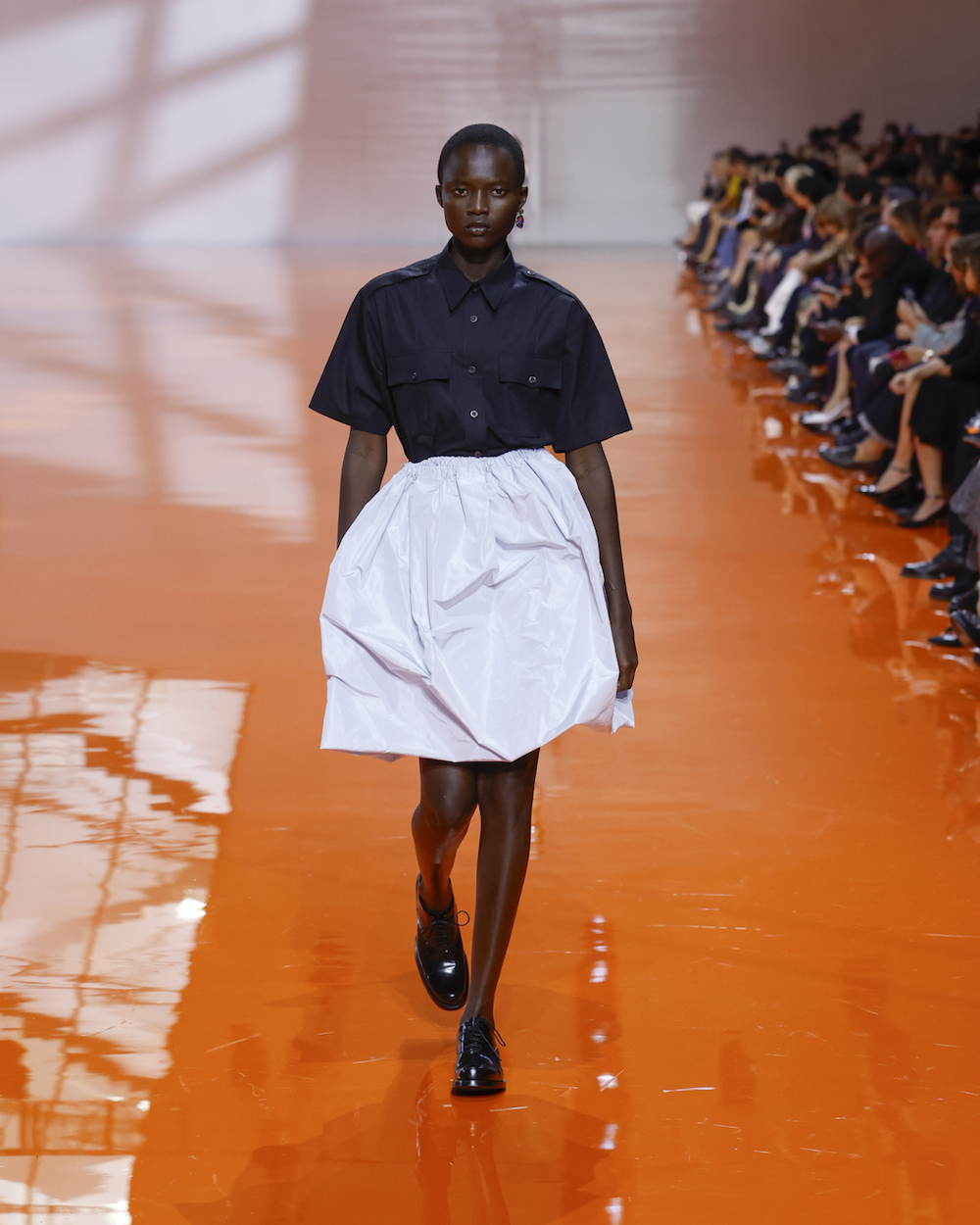 Mrs Prada explained: “Inevitably, when we create we think about the world around us. The future is unknown. This collection is about reacting to the uncertain – clothes that can shift, change, adapt. In the combination of the different elements, in this idea of composition, there is a choice and freedom, authority and agency for the woman wearing them. It is fashion that is connected inherently to the world, with a meaning and usefulness. How to face the world, and how to survive.” It was two fingers to conformity and anonymity. And we loved it.