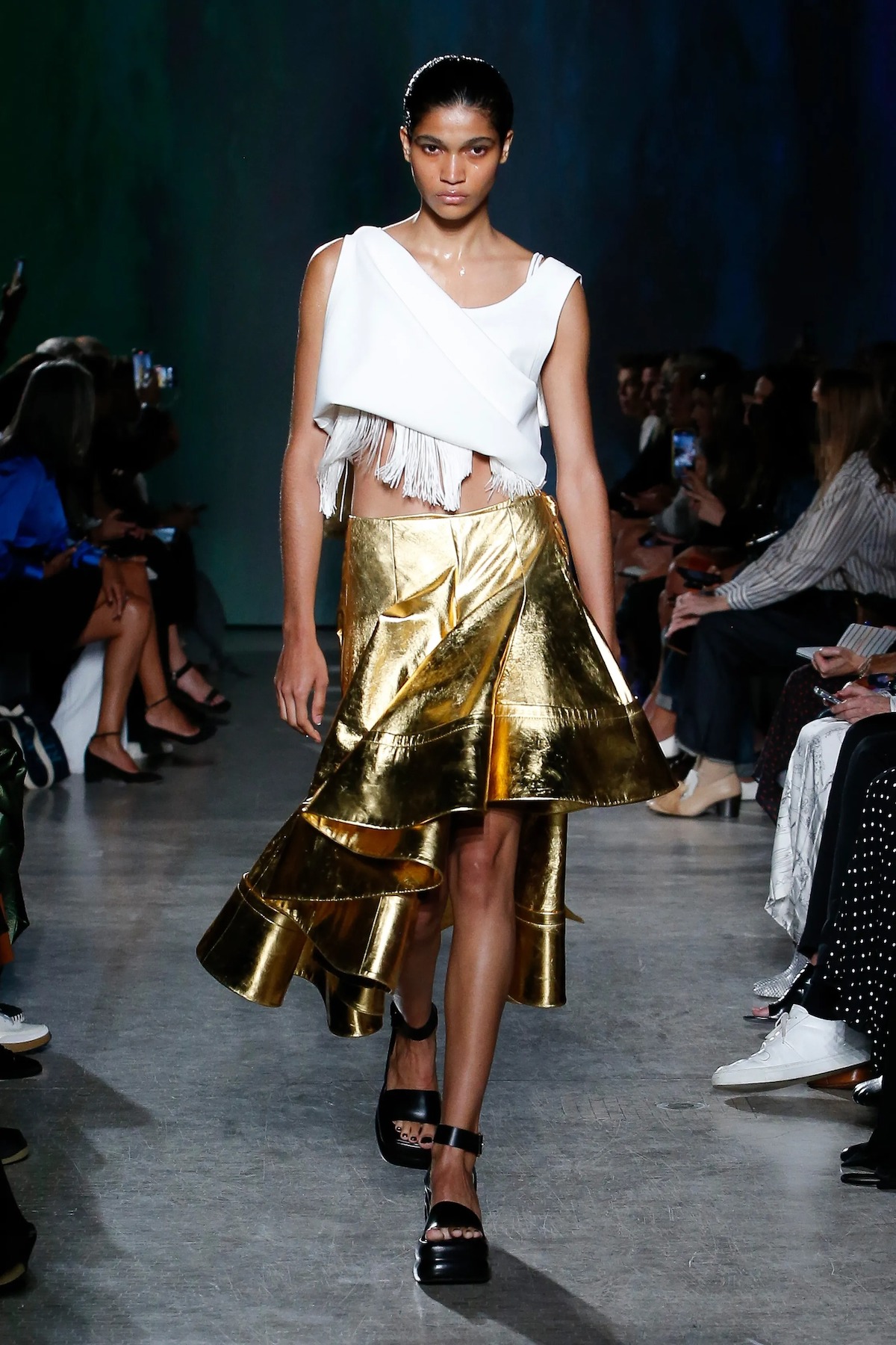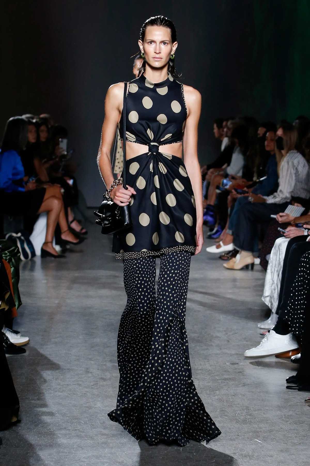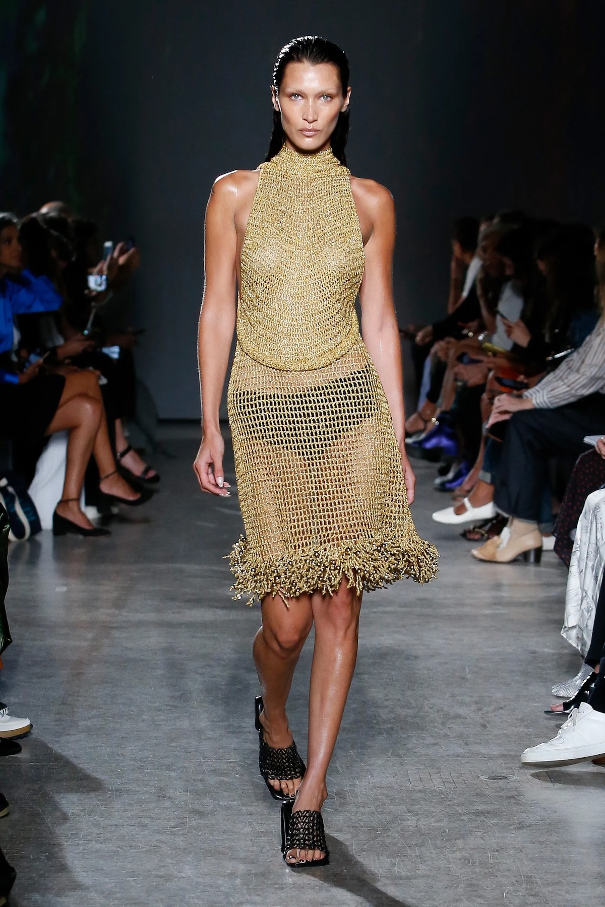 Against a projected waterfall backdrop, the likes of Bella Hadid, Kendall Jenner and Shalom Harlow emerged as if they’d just taken a dip – with dewy complexions and wetted locks. Though this troupe’s fringed, crocheted twinsets, ruched leather skirts and pulka-dotted frocks – cut short, knotted at the waist, and exposed at the hips – would feel more at home on strobe-drenched dancefloors. The opening look – modelled by experimental musician Arca – consisted of a puffy skirt and a tank top pulled across the shoulder to expose the mid-riff and a curtain of fringe – as if caught mid-motion amongst a sea of sweaty bodies. The following procession of flamenco-inspired bell bottoms and sleeves that cascaded with ruffles showed the design duo at their most joyous. These are clothes built for life’s simplest pleasures.