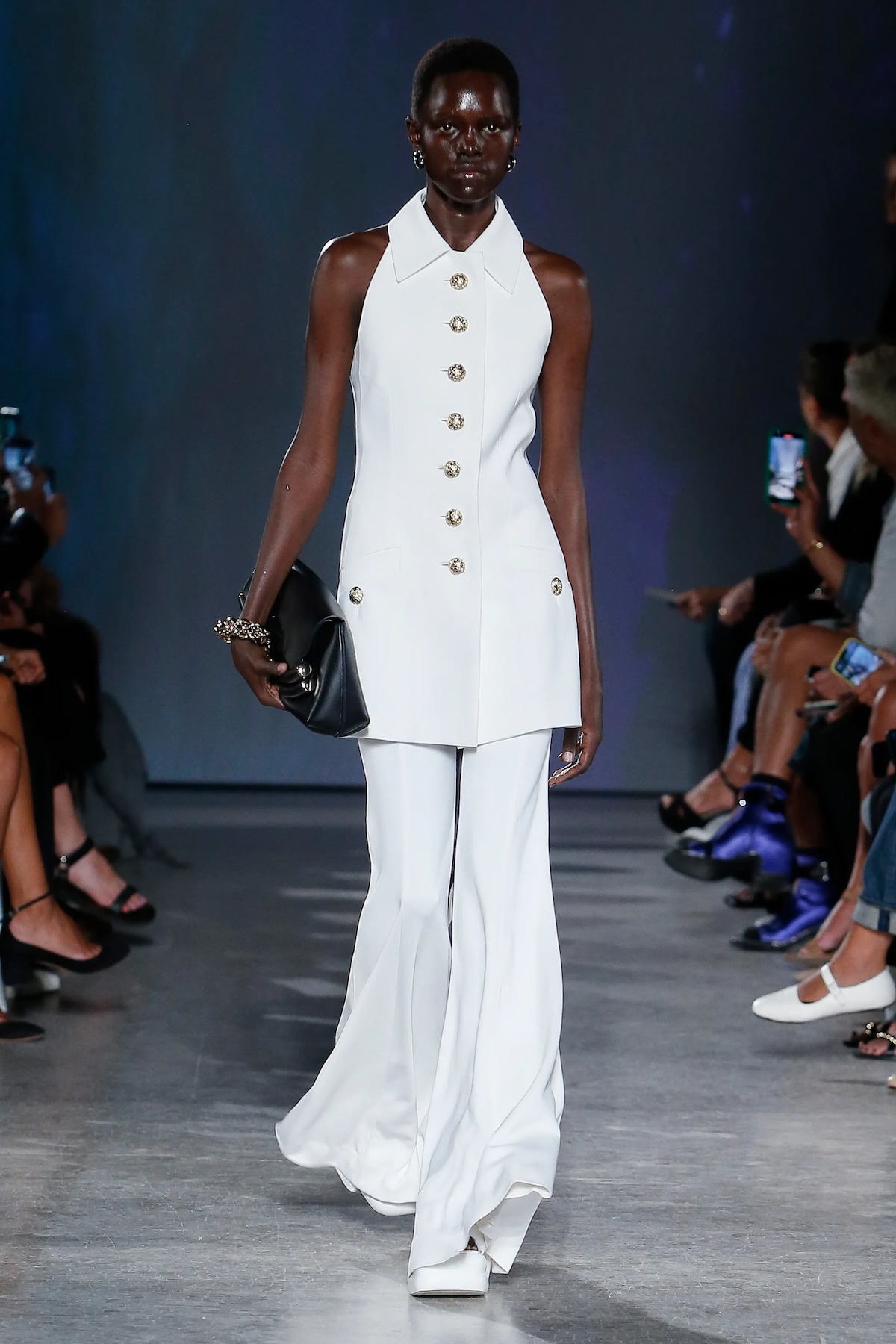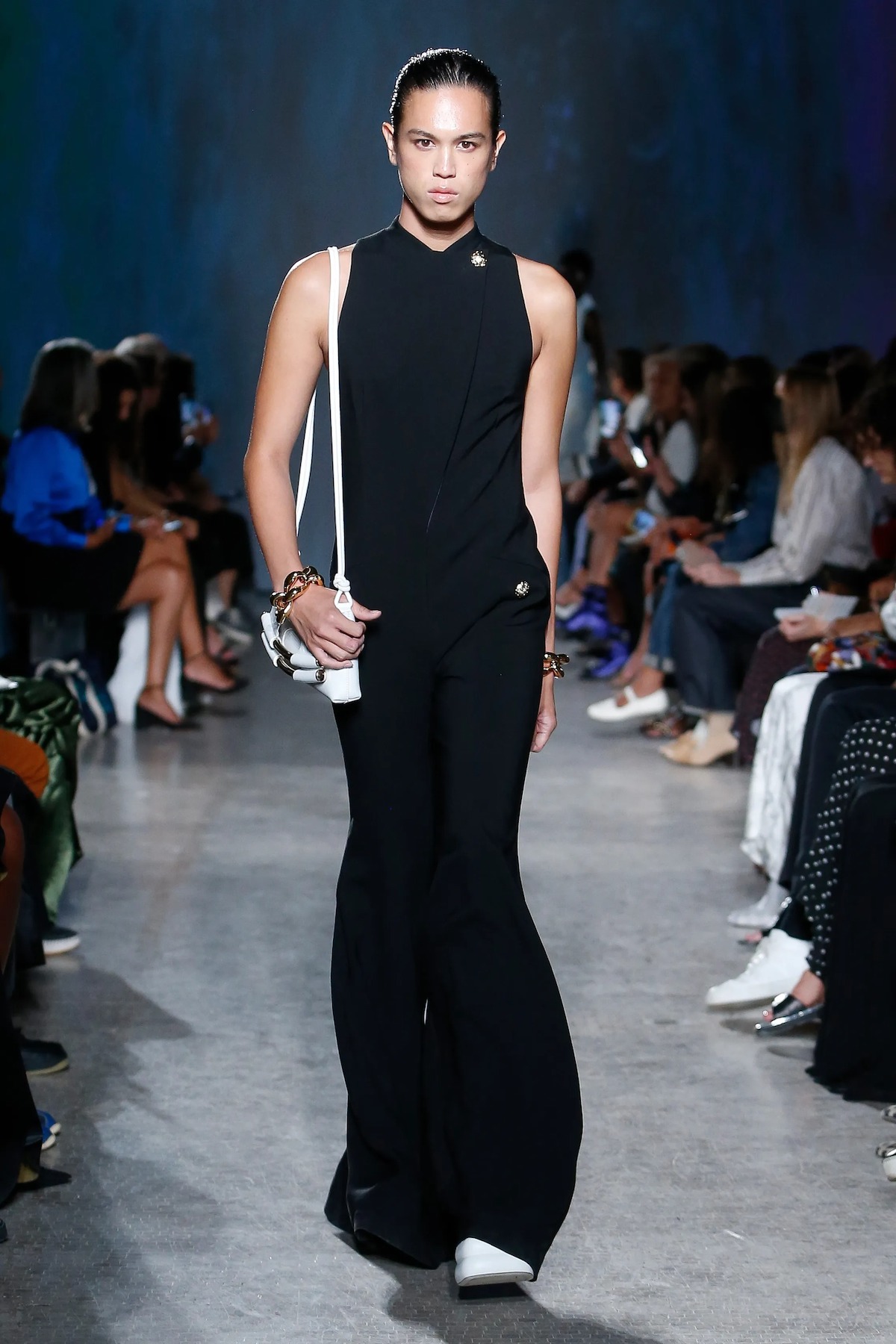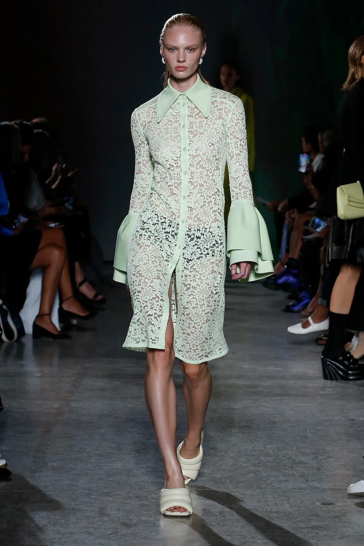 Against a projected waterfall backdrop, the likes of Bella Hadid, Kendall Jenner and Shalom Harlow emerged as if they’d just taken a dip – with dewy complexions and wetted locks. Though this troupe’s fringed, crocheted twinsets, ruched leather skirts and pulka-dotted frocks – cut short, knotted at the waist, and exposed at the hips – would feel more at home on strobe-drenched dancefloors. The opening look – modelled by experimental musician Arca – consisted of a puffy skirt and a tank top pulled across the shoulder to expose the mid-riff and a curtain of fringe – as if caught mid-motion amongst a sea of sweaty bodies. The following procession of flamenco-inspired bell bottoms and sleeves that cascaded with ruffles showed the design duo at their most joyous. These are clothes built for life’s simplest pleasures.