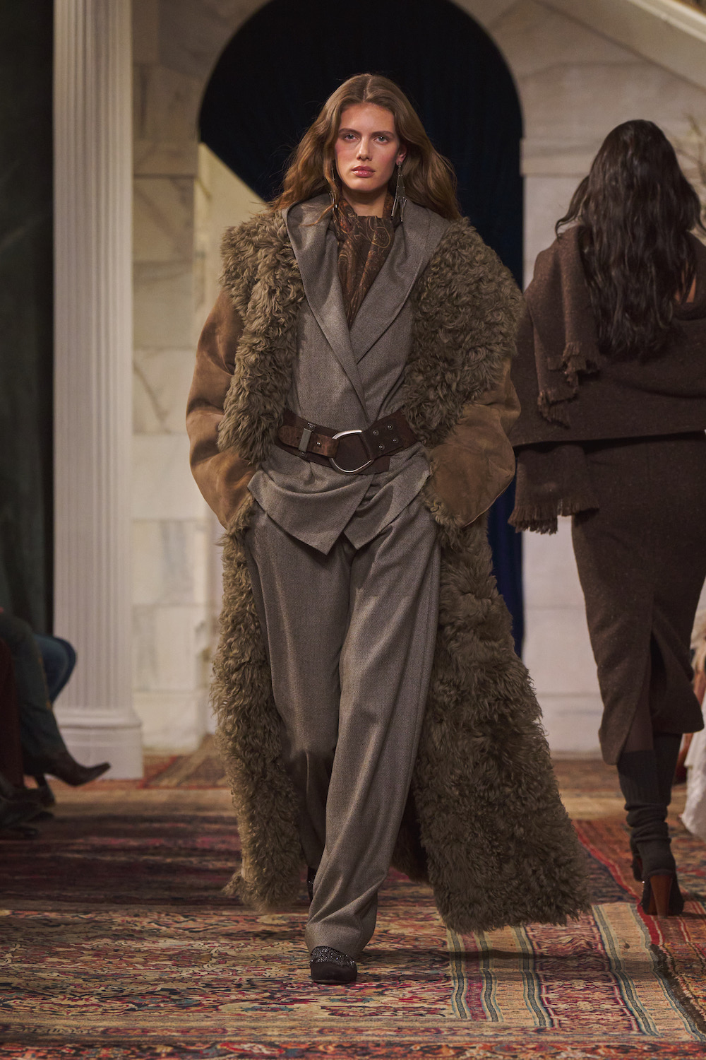 Details count in a Ralph Lauren show, and autumn 2026 was no different. One jacket was designed to reverse from shearling pile to cracked metallic foil while another featured hand-distressed leather. A third, a leopard-print shearling, got its bubble shape courtesy of a hidden crinoline layer. Eveningwear, always a strong suit, also received the same level of care. Take, for example, a high-neck sequin column dress, which used flocked velvet to create a moody effect while a different gown showcased a double dyeing technique, layering brown and dark blue for a certain luminescence. Even the tops had their moment in the sun, namely one that had a unique juxtaposition of glass-bead fringing that gave it a delicacy. From painting to the addition of leather strips, you could see the level of craftsmanship required for these looks.