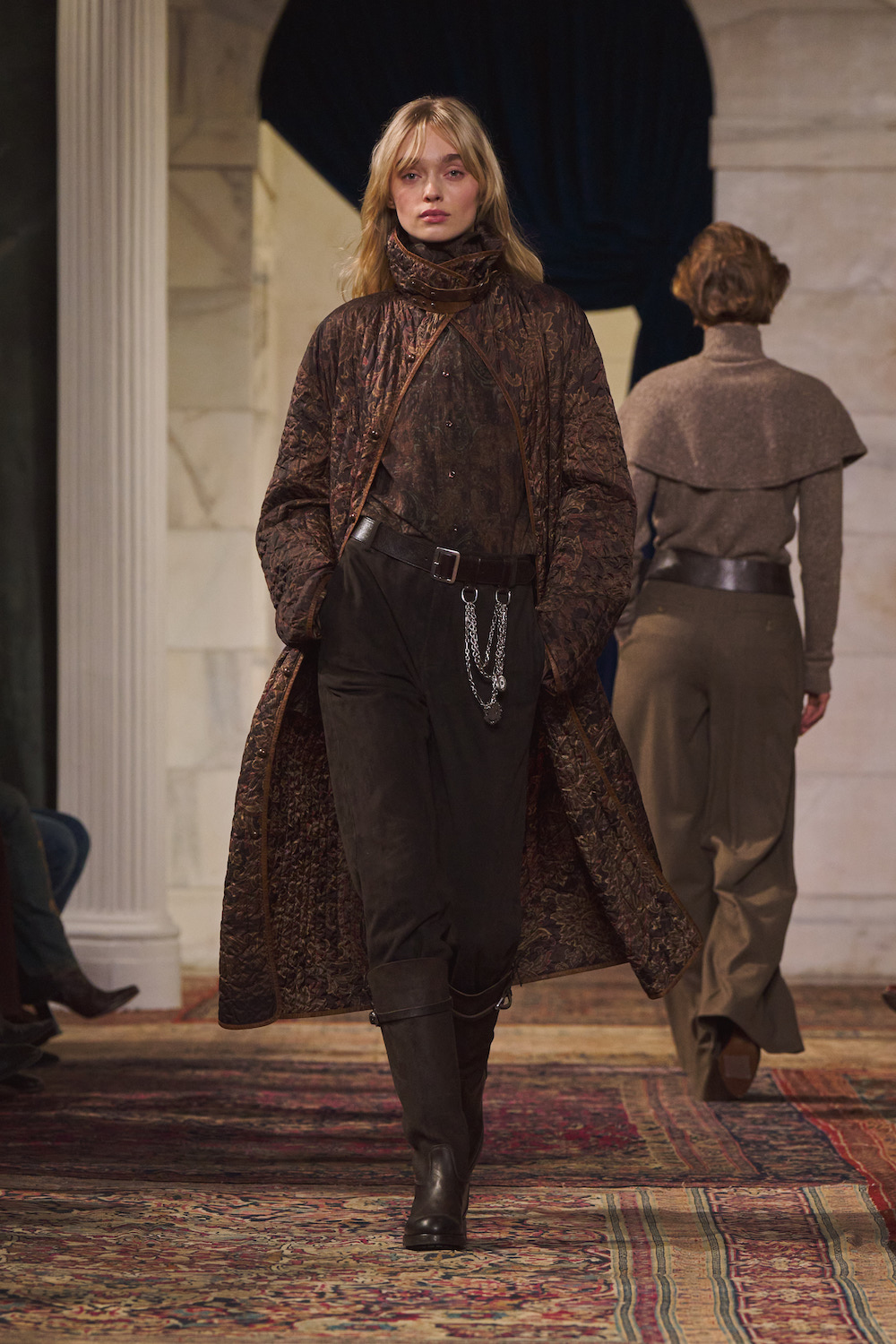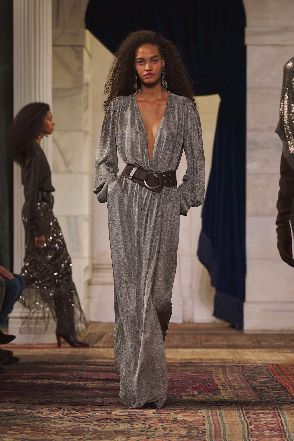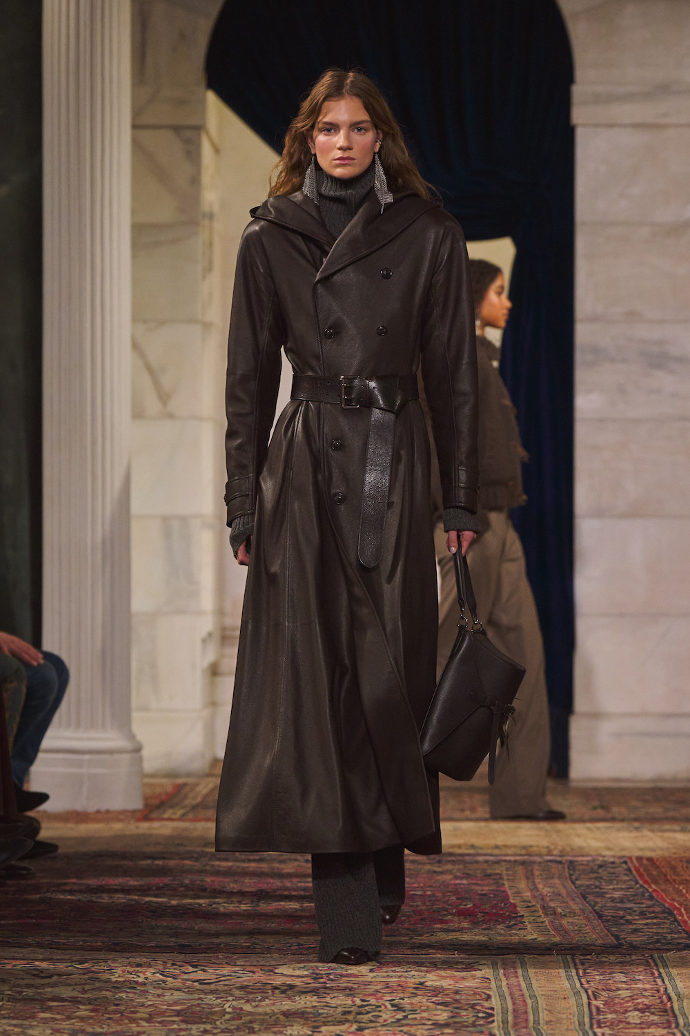 As for the accessories, they anchored the idea that this Ralph Lauren woman loves an unexpected finishing touch. Whether it was riding boots or embroidered velvet slippers, footwear was functional yet stylish. Meanwhile the jewellery was delightfully vintage-inspired, be it the brooches attached to sashes on blazers or the slew of dangly earrings that peeked out of bouncing hair. Handbags spanned practical to glamorous as the Ralph bag was trotted out in both tote and mini crossbody forms while a new Deco Lock clutch included a chain handle that sat on the hand like a bracelet.