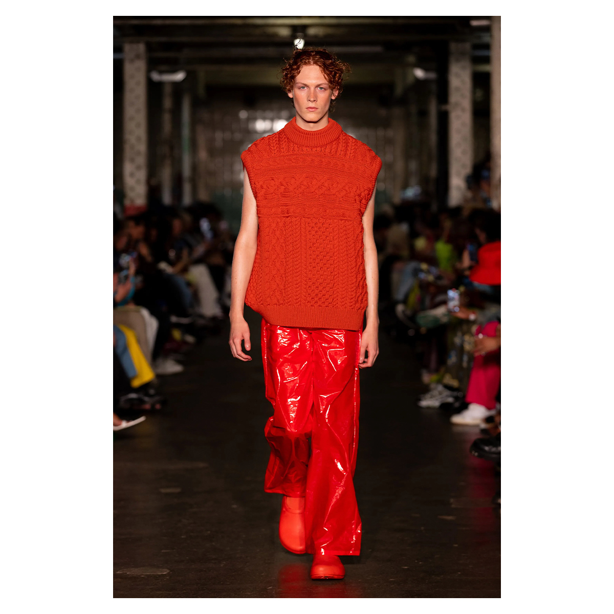 Since her Fashion East debut, Lynch has proven to be a maestro of elevating everyday dress, best displayed here by towelling ponchos cut from two-toned bouclé, cargos sliced into three-quarter lengths, and “drunk” Aran cable knits, deconstructed to create wavy shirts, shorts and bucket hats. Think package holidays, just now with a wardrobe that packs a punch.
