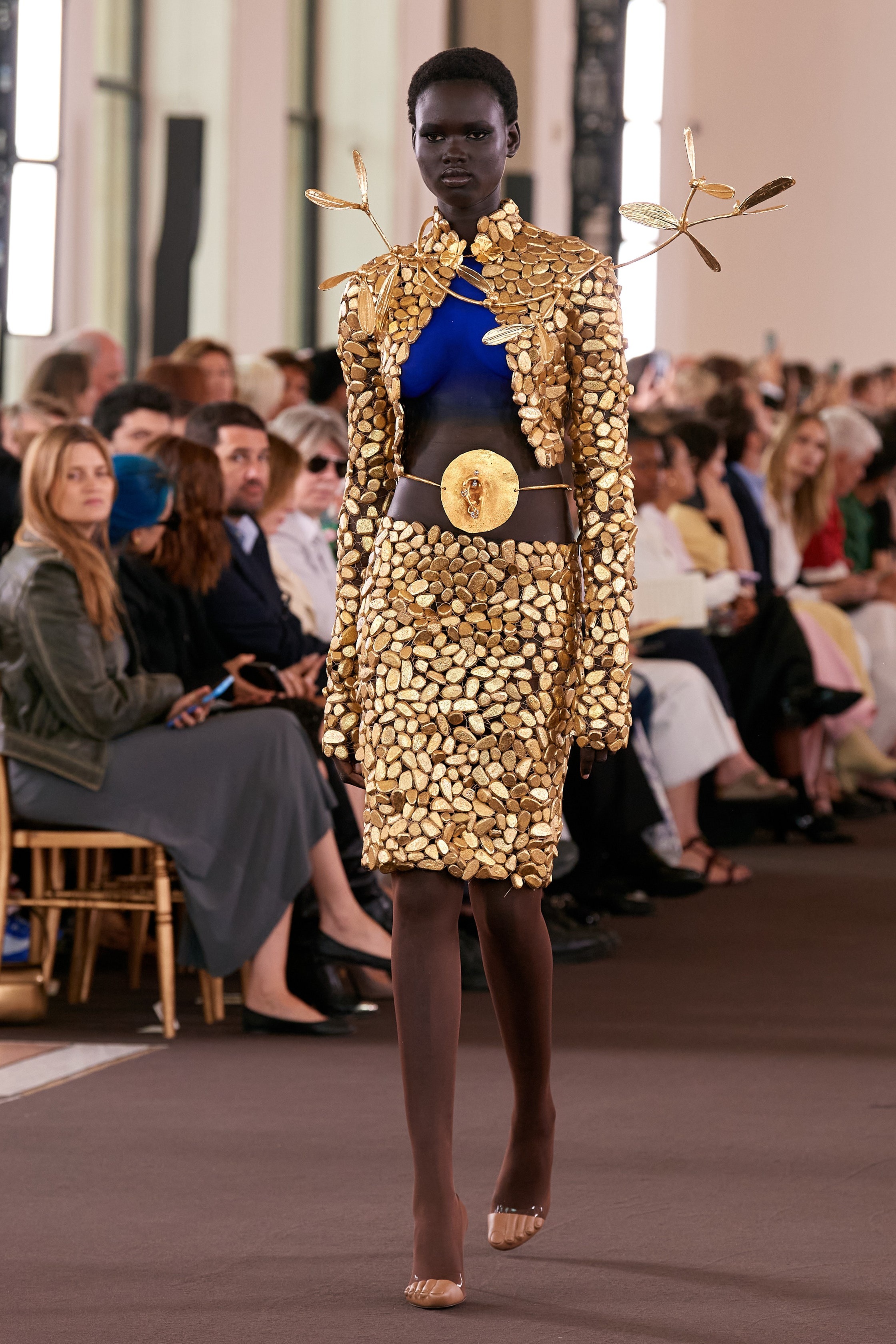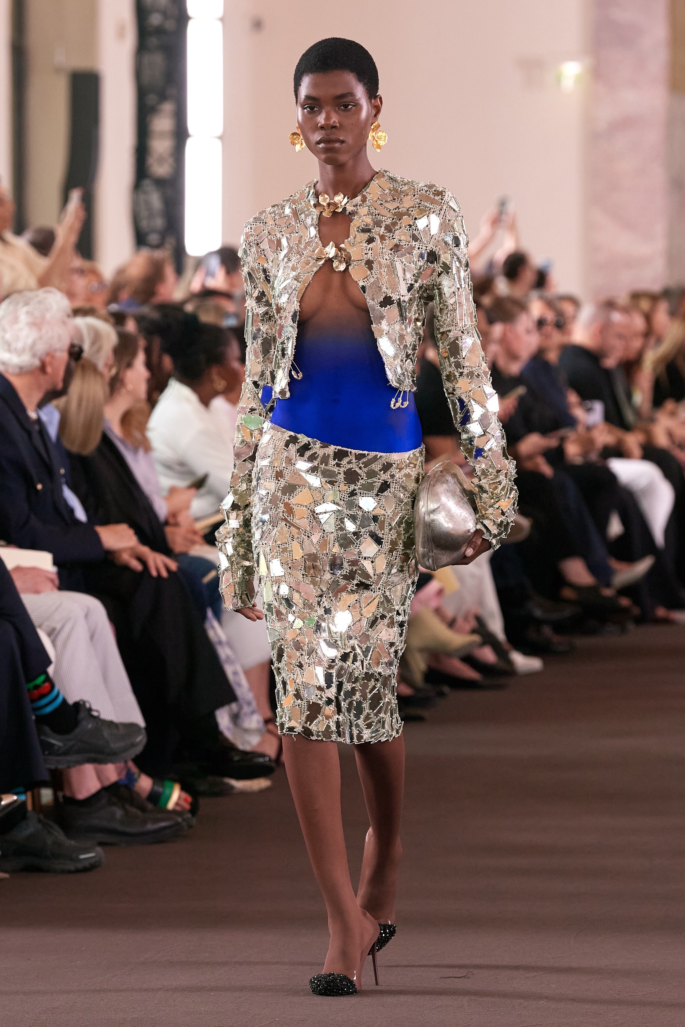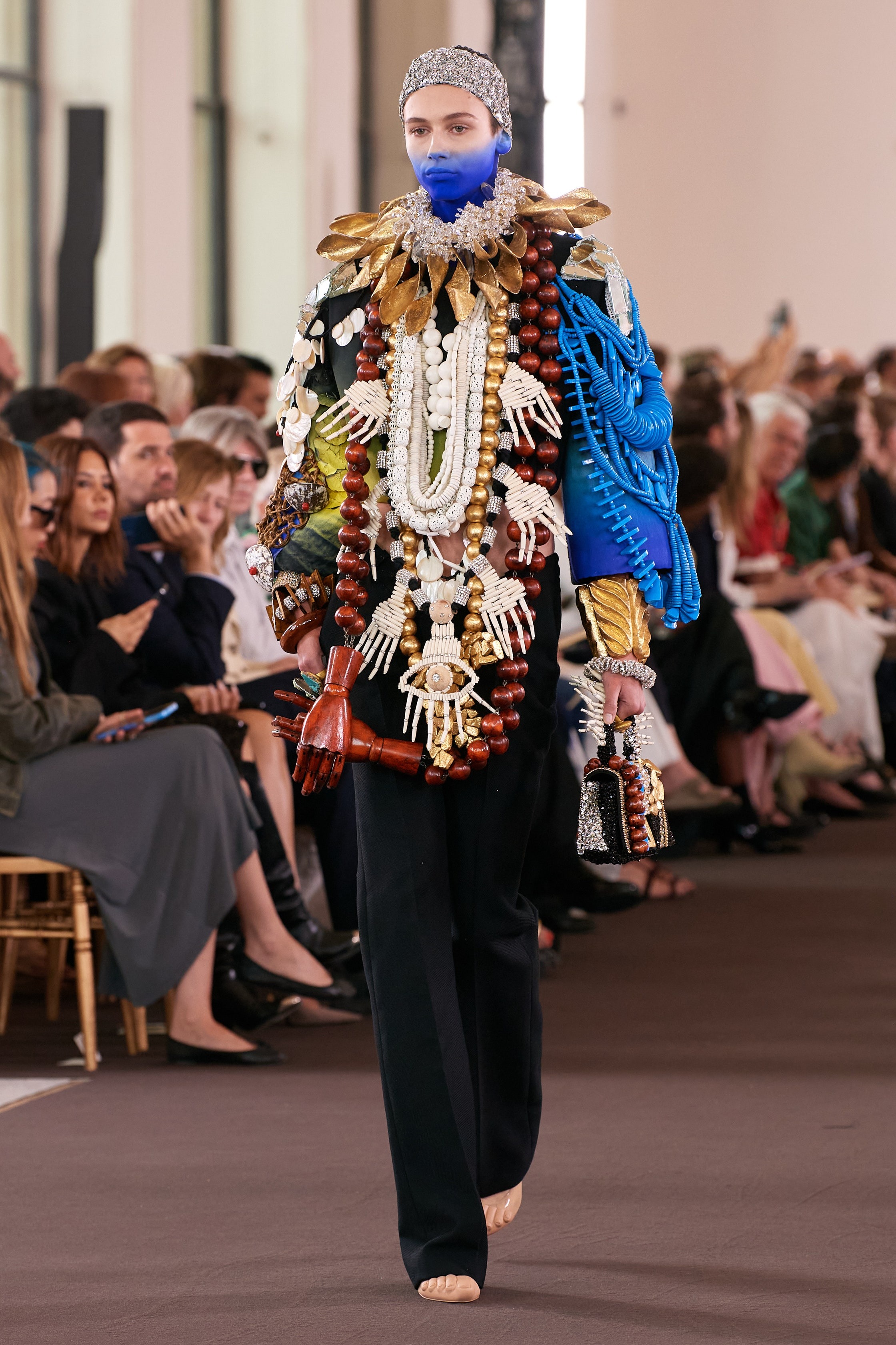 Whilst his previous outings have leant heavily into the surrealist foundations of the house, this couture collection saw a more spontaneous side to Roseberry. Dresses came fashioned from painterly swirls, whilst Yves Klein blue migrated from skater skirts to the necks and torsos of models. Elegant duvet coats proved a highlight, as did a parade of sensually draped corseted frocks with goddess-like qualities. “I wanted this collection to be aggressively, unmistakably human – and to be rooted in artistic references that feel timeless. To dress, decorate, but most importantly, to create, is as primitive as any instinct we have.”
