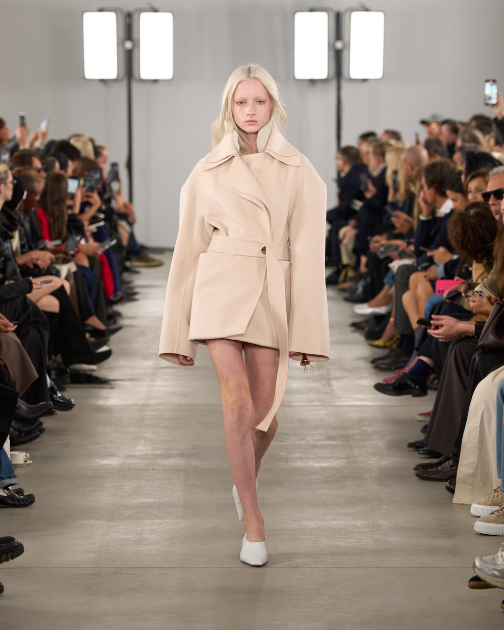 Organza featured prominently and was worked into classic shapes like trenches and tailored trousers, giving them an unexpected lightness. Doublé wool and soft glove leather grounded the collection, bringing weight and form to otherwise fluid silhouettes. Botanical prints – conceived from drawing painted using Japanese lipsticks and nail polishes – appeared in layered sheers, offering subtle movement and colour without overwhelming looks.