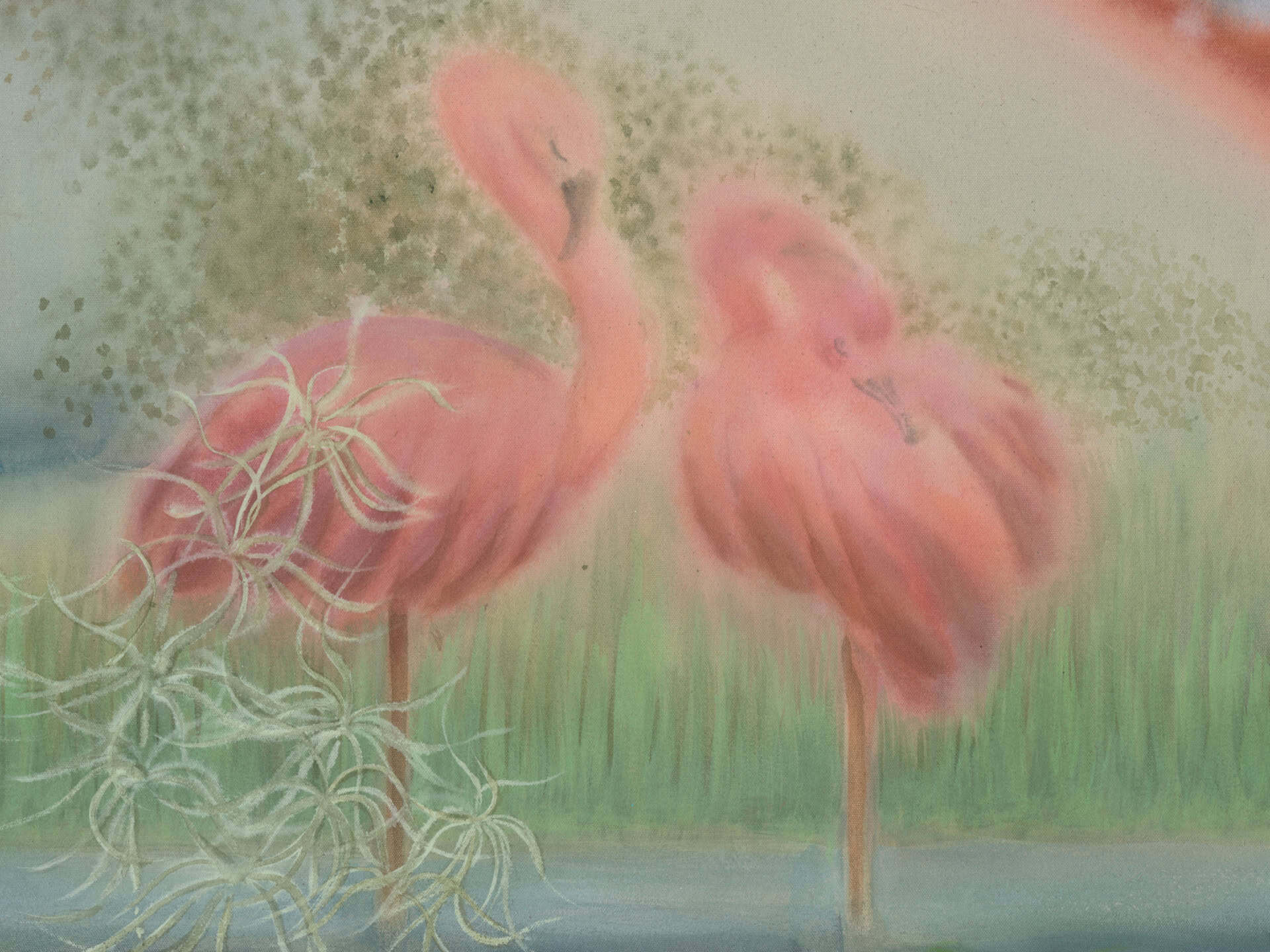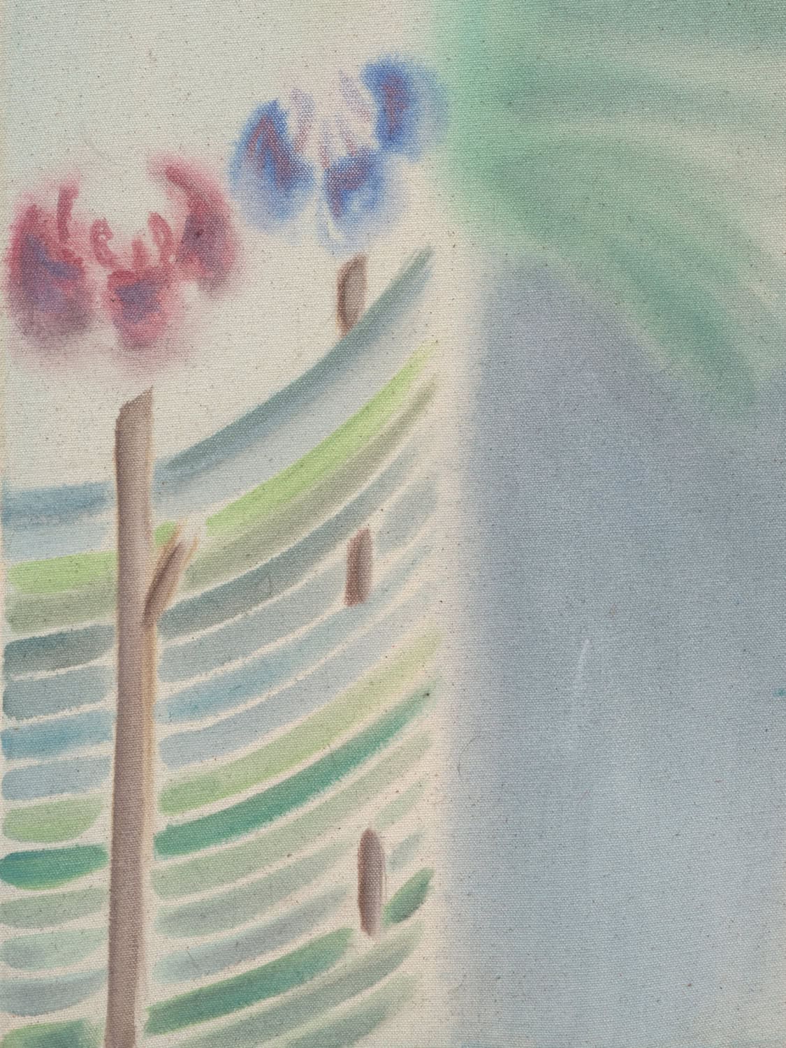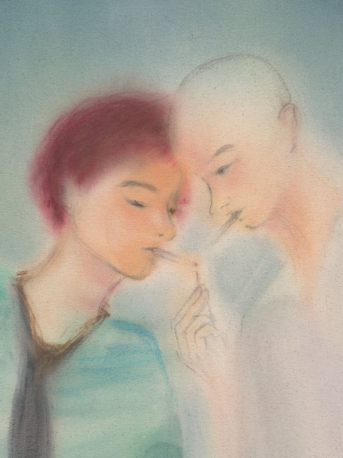 In artist Xingzi Gu’s dreamy paintings, people appear as if through a fogged-up window. They lounge on a hammock, ride two to a bike, light one another’s cigarettes, their heads butted closely together. In one painting, someone sits at a sewing machine while a figure holding a plant lingers in the doorway. Colours merge and seep into one another, like a dream.