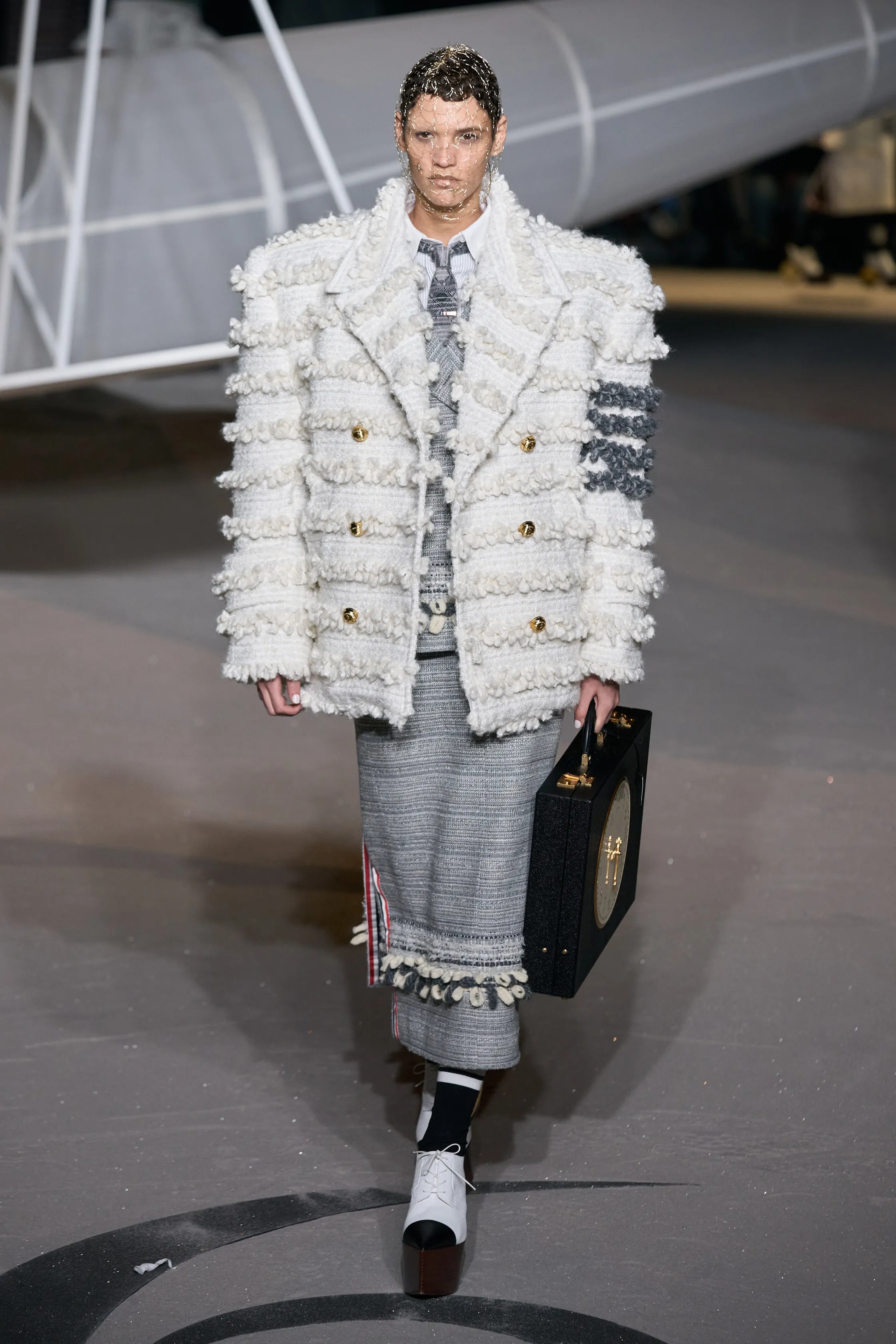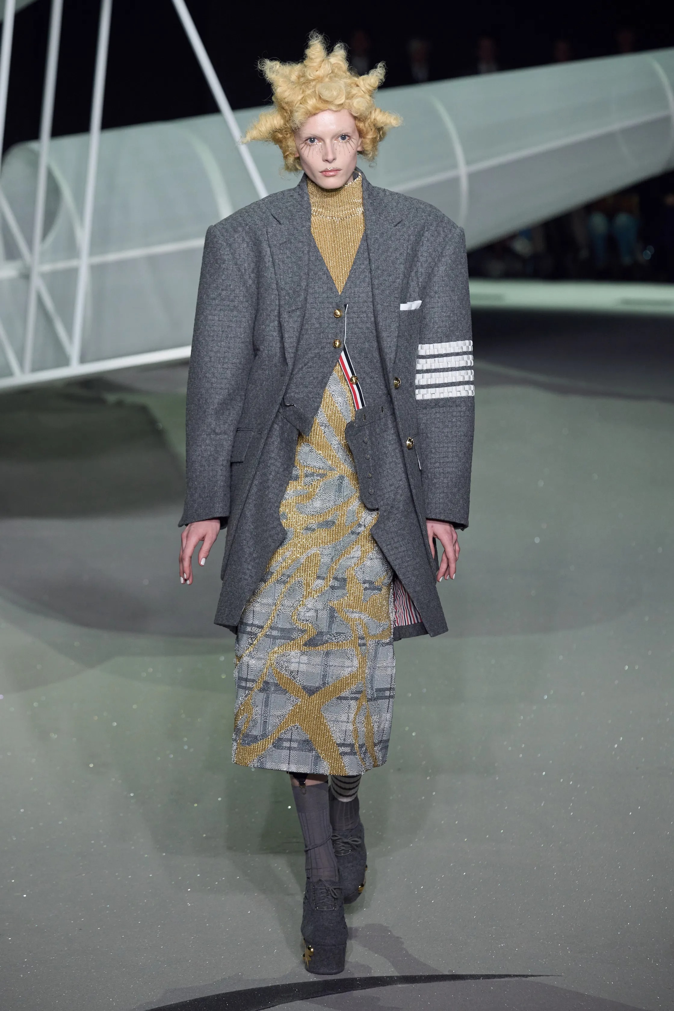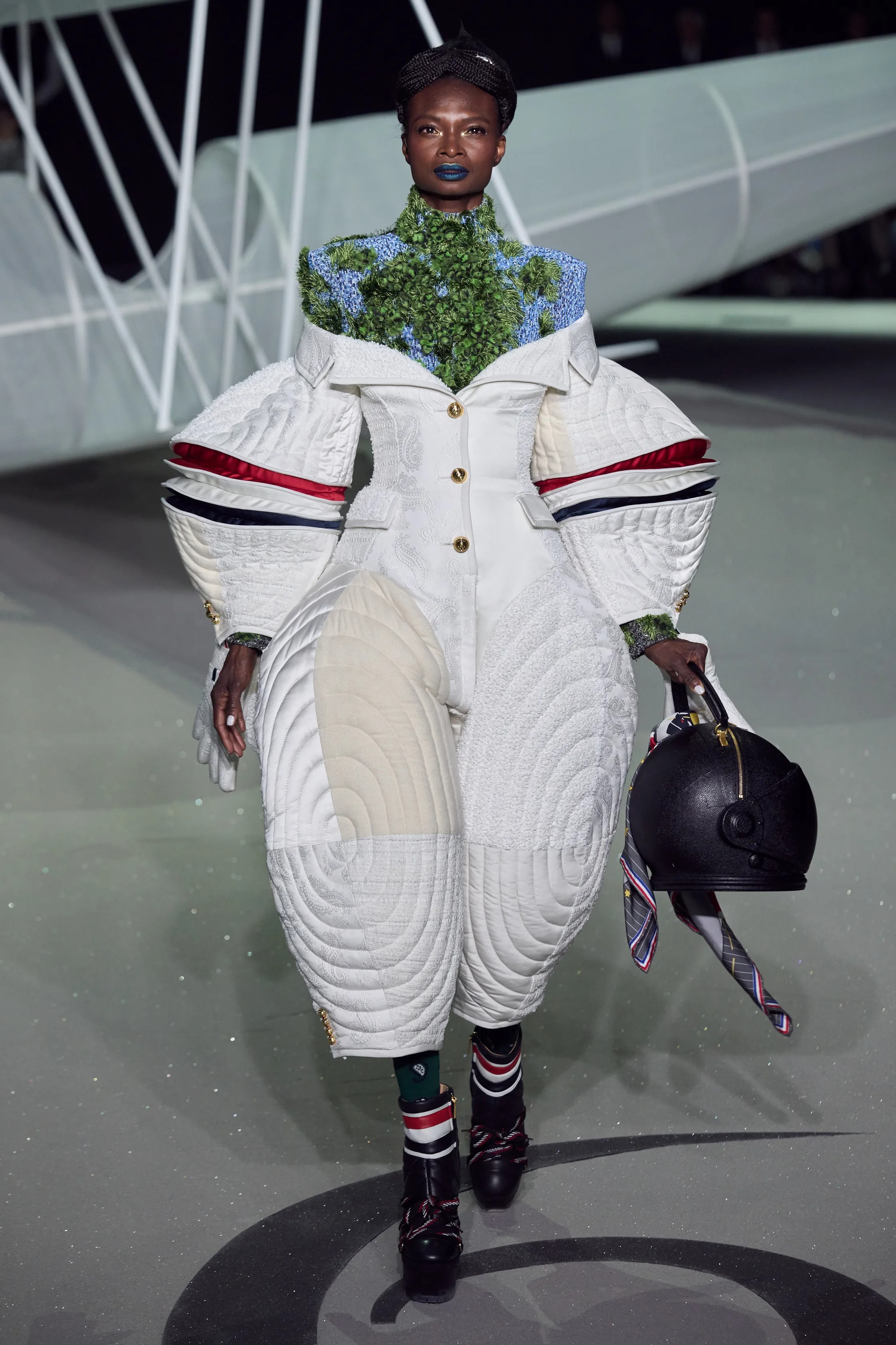 Earlier this year, Thom Browne began his role as chairman of the CFDA, returning to New York Fashion Week last night with a collection largely based on The Little Prince by Antoine de Saint-Exupéry. The story – which follows a boy living on an asteroid who stumbles upon a lost pilot who has crashed in a desert – inspired Browne to envision quite the set, as a cluster of planets (ironically, looking a bit like spy balloons) hung high above a giant plane plonked in a lake of sand.