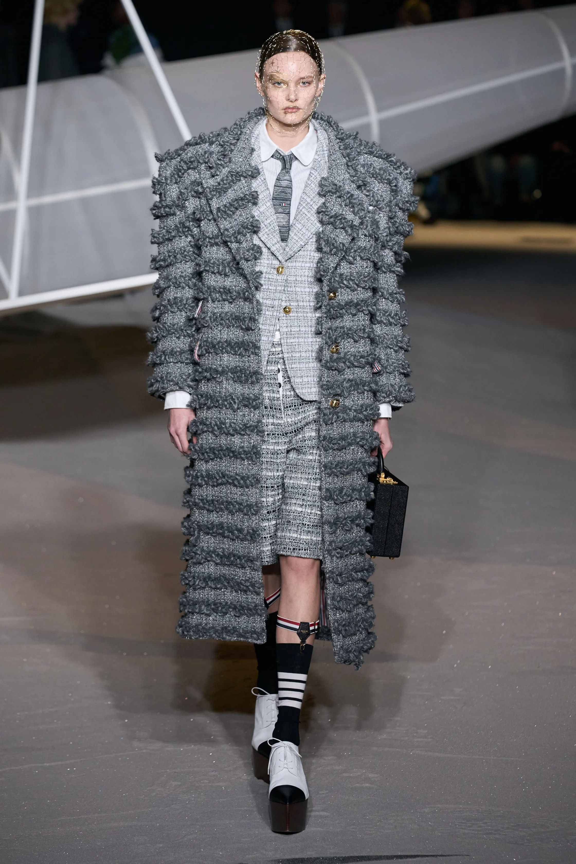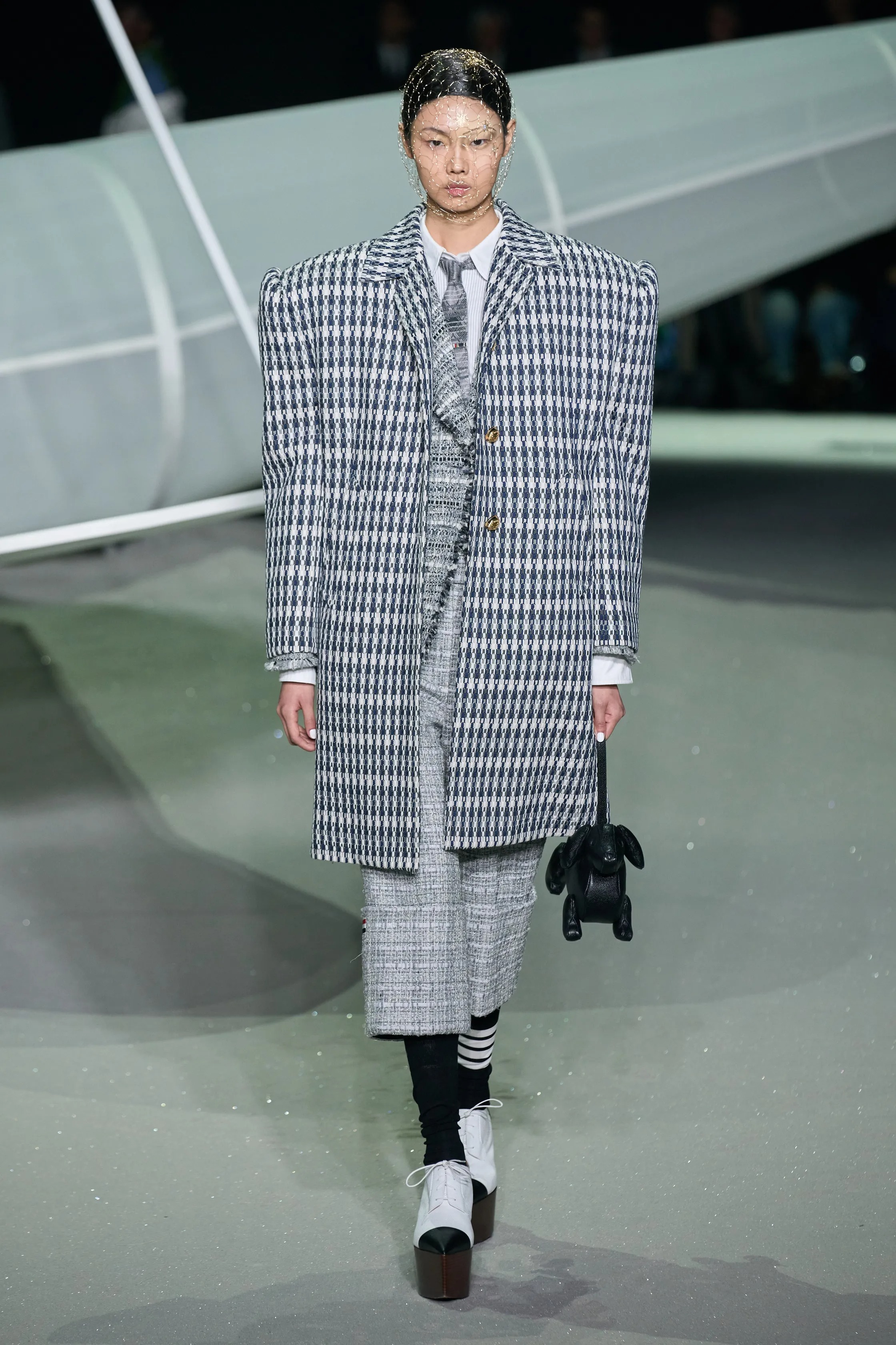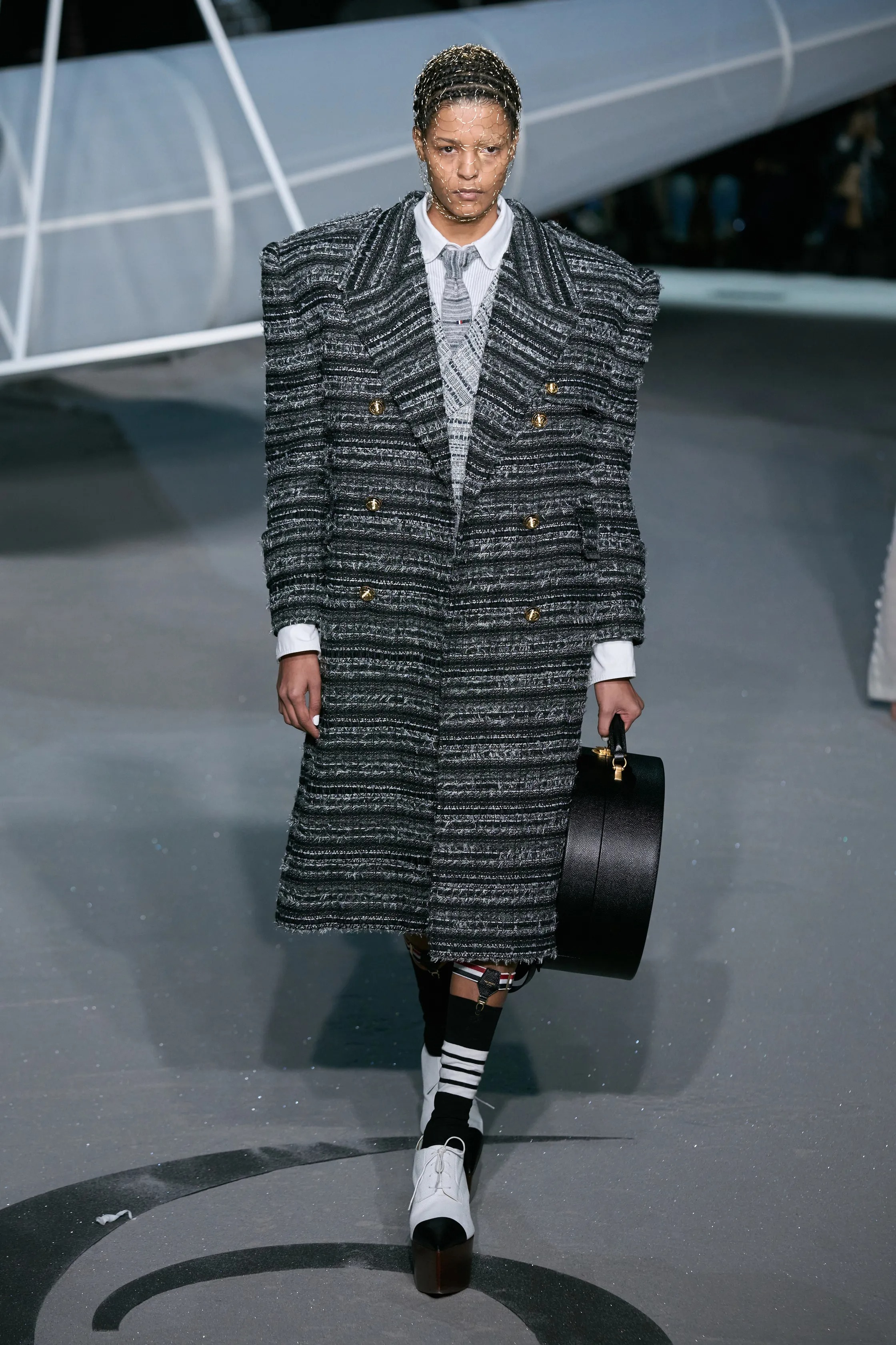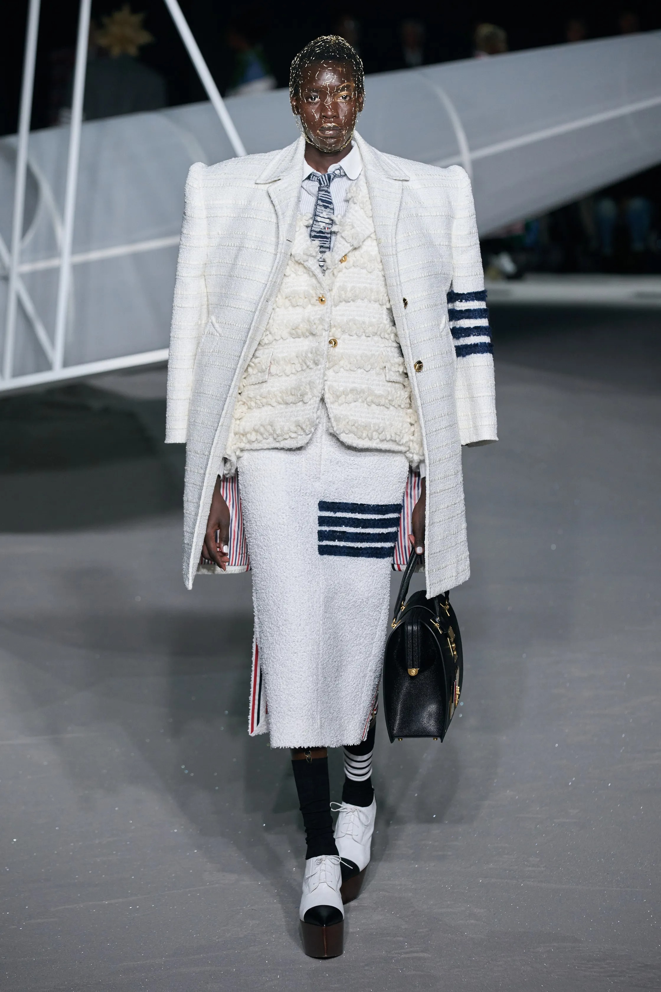 Earlier this year, Thom Browne began his role as chairman of the CFDA, returning to New York Fashion Week last night with a collection largely based on The Little Prince by Antoine de Saint-Exupéry. The story – which follows a boy living on an asteroid who stumbles upon a lost pilot who has crashed in a desert – inspired Browne to envision quite the set, as a cluster of planets (ironically, looking a bit like spy balloons) hung high above a giant plane plonked in a lake of sand.