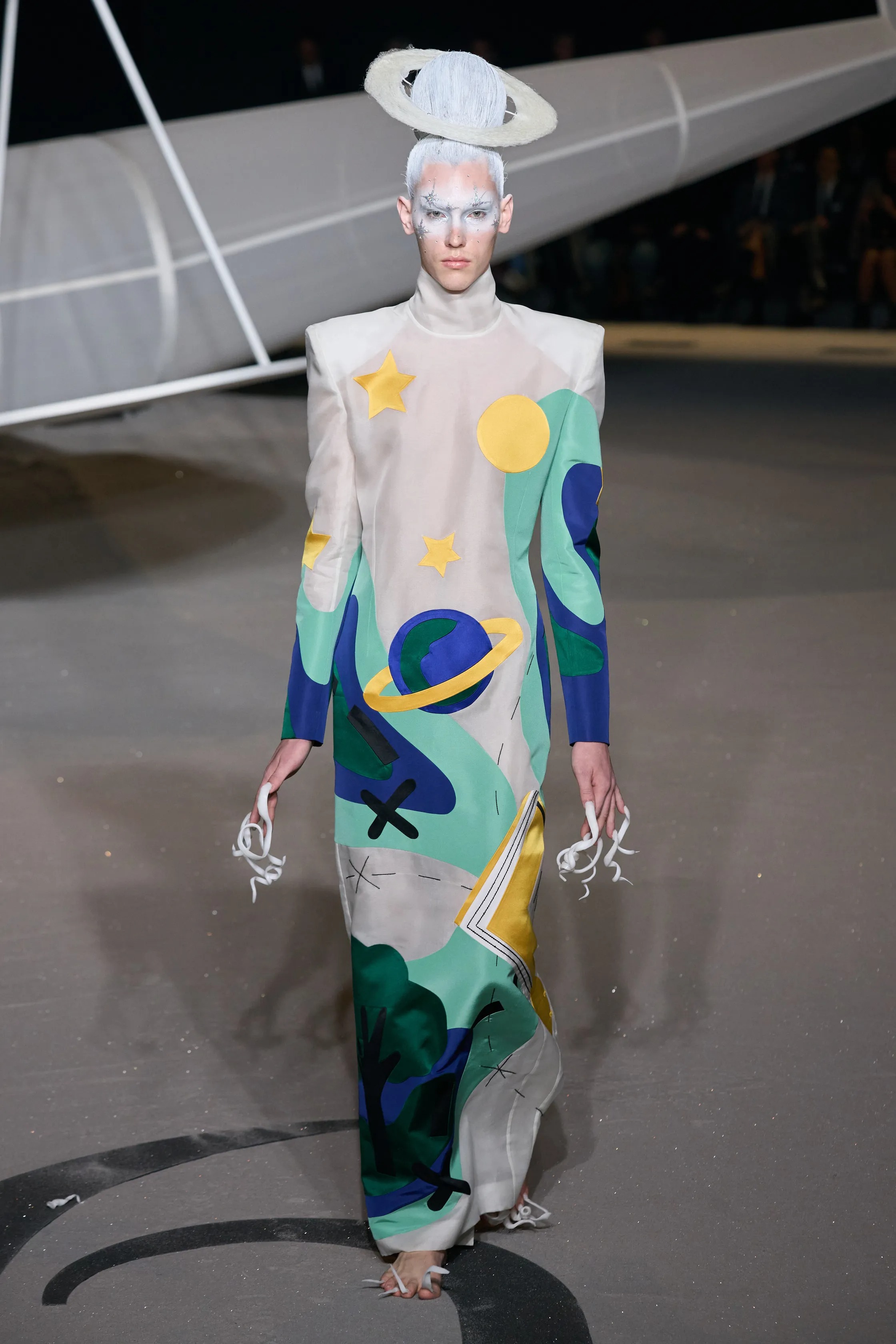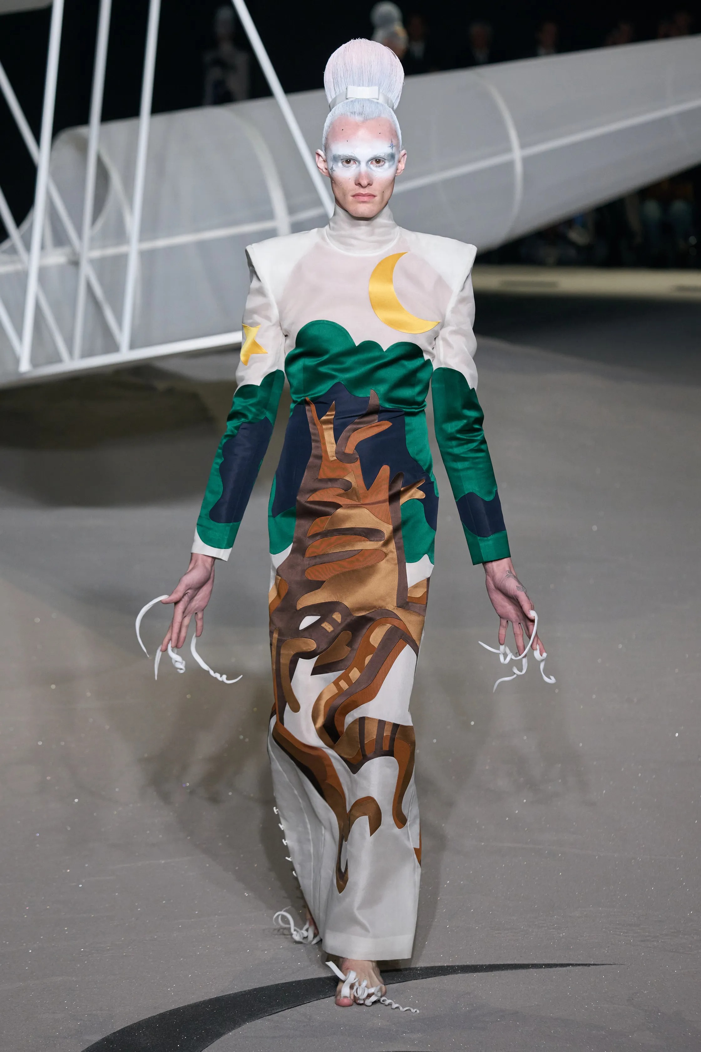 The clothes were equally as grand. Browne, whose brand is built on strict, shrunken tailoring, lets fantasy flourish when it comes to his catwalk spectacles. Here, brocade tweed overcoats, in Browne’s signature red, white and blue colourway, came with hulking shoulders. Some models looked like the Nutcracker, if only he was descended from outer space, sporting sculpted plaid pencil skirts and crop tops, with paisley jacquard bodycon frocks worn beneath.