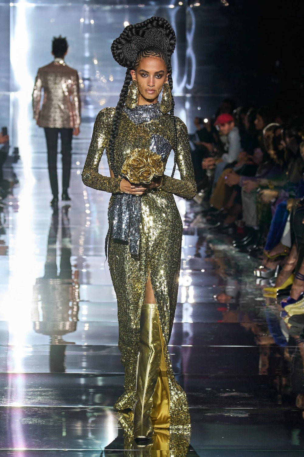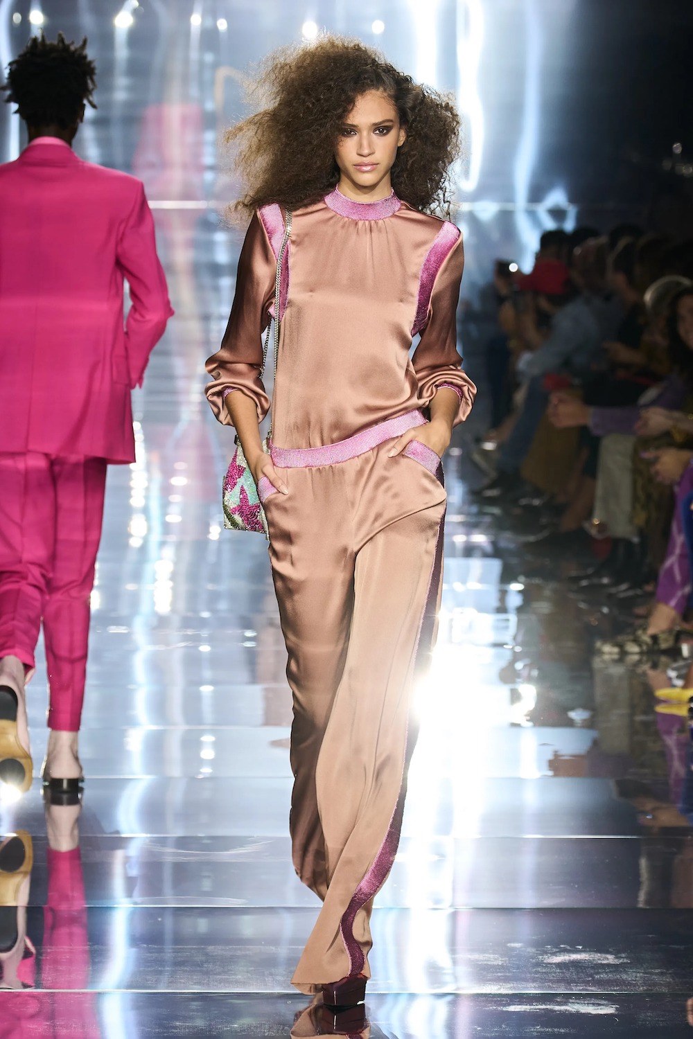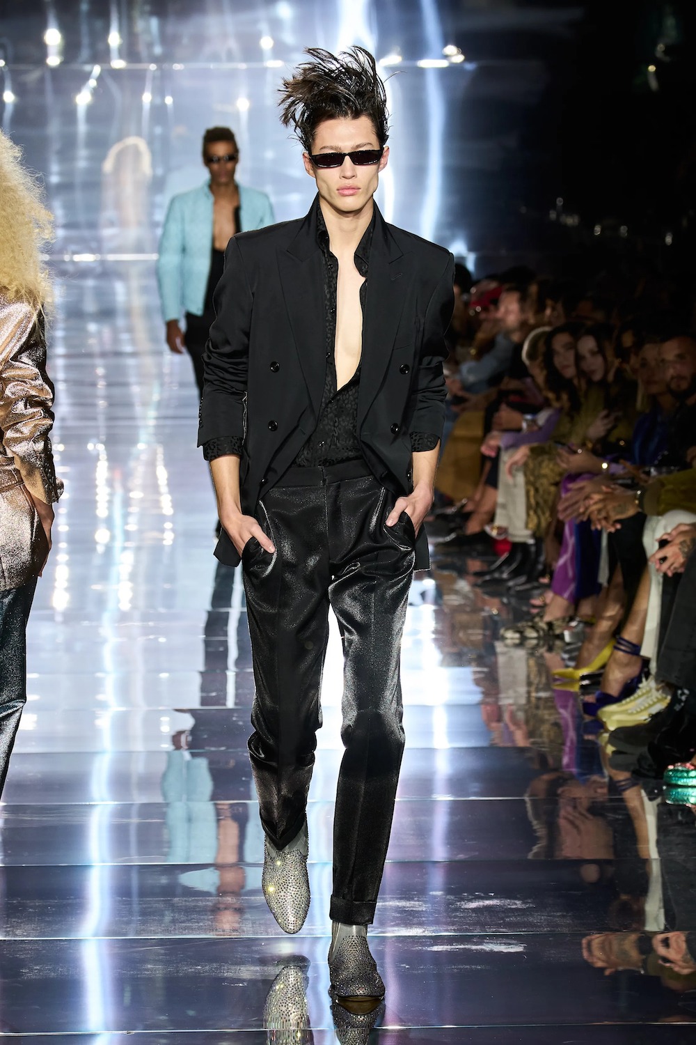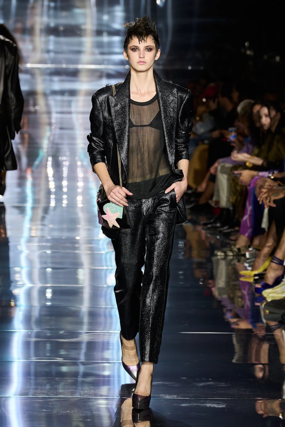 Tom Ford designs for the spotlight. Closing out a stellar NYFW season with the sort of star-studded panache that could’ve dressed the entire Studio 54 dancefloor, Ford was at his best, doing what he does best: concocting a wardrobe that’s fit for the brightest names in Hollywood. This season’s repertoire included teeny-weeny, sheer bras worn beneath glitzy blazers, shiny, belly-baring tracksuits, crinkly sports shorts and the sort of velvet hot pants you’d chuck on for a proper night out-out. Signature Ford suiting featured throughout, arriving in glittered leopard print and sugary pink variations, and came paired alongside underwear veiled by a curtain of black lace and satin shirts – a Ford favourite. Total glitz by the truck full. A procession of sequinned evening gowns with matching XXL hoop earrings closed out proceedings. Despite rumours swirling that Ford could be selling his business, this industry veteran has no intention of blending into the shadows.