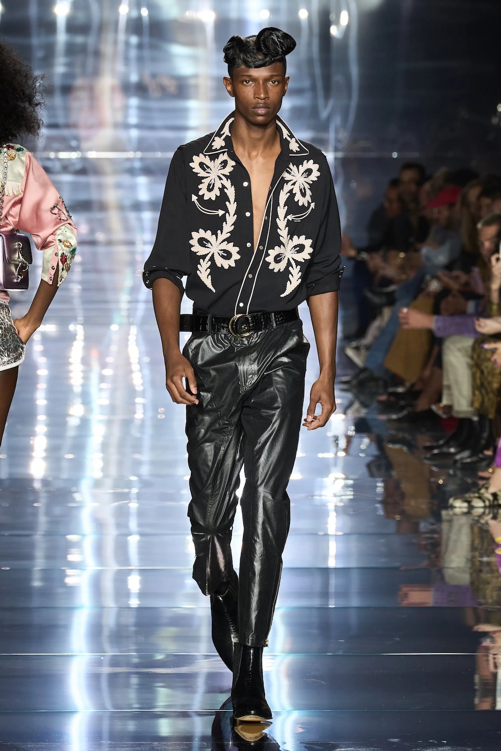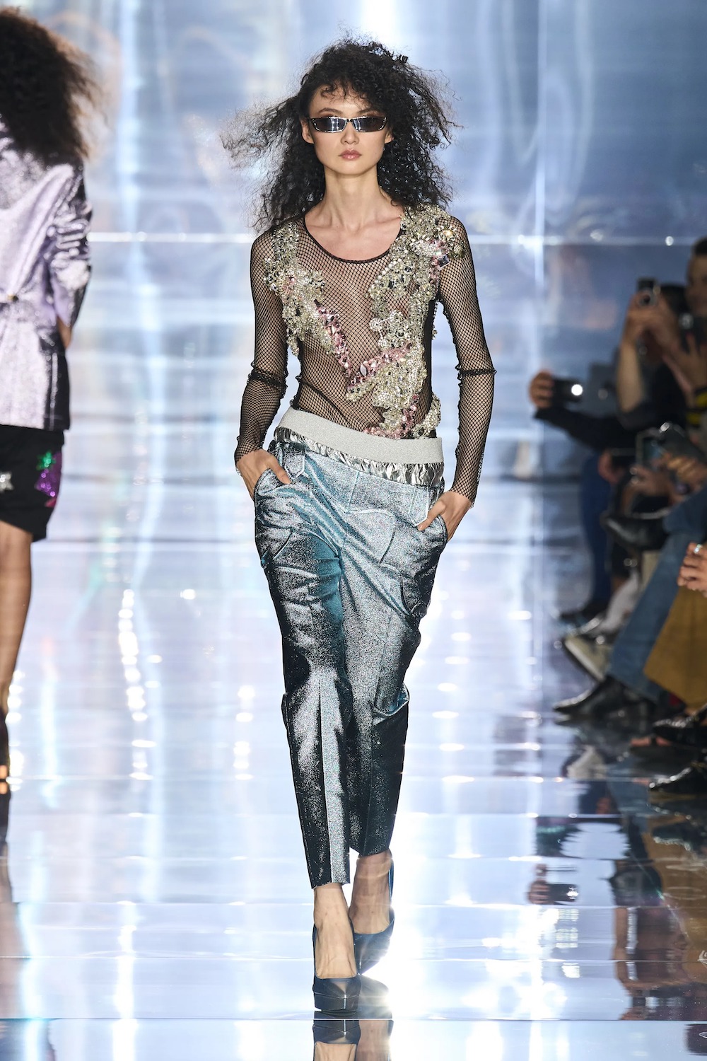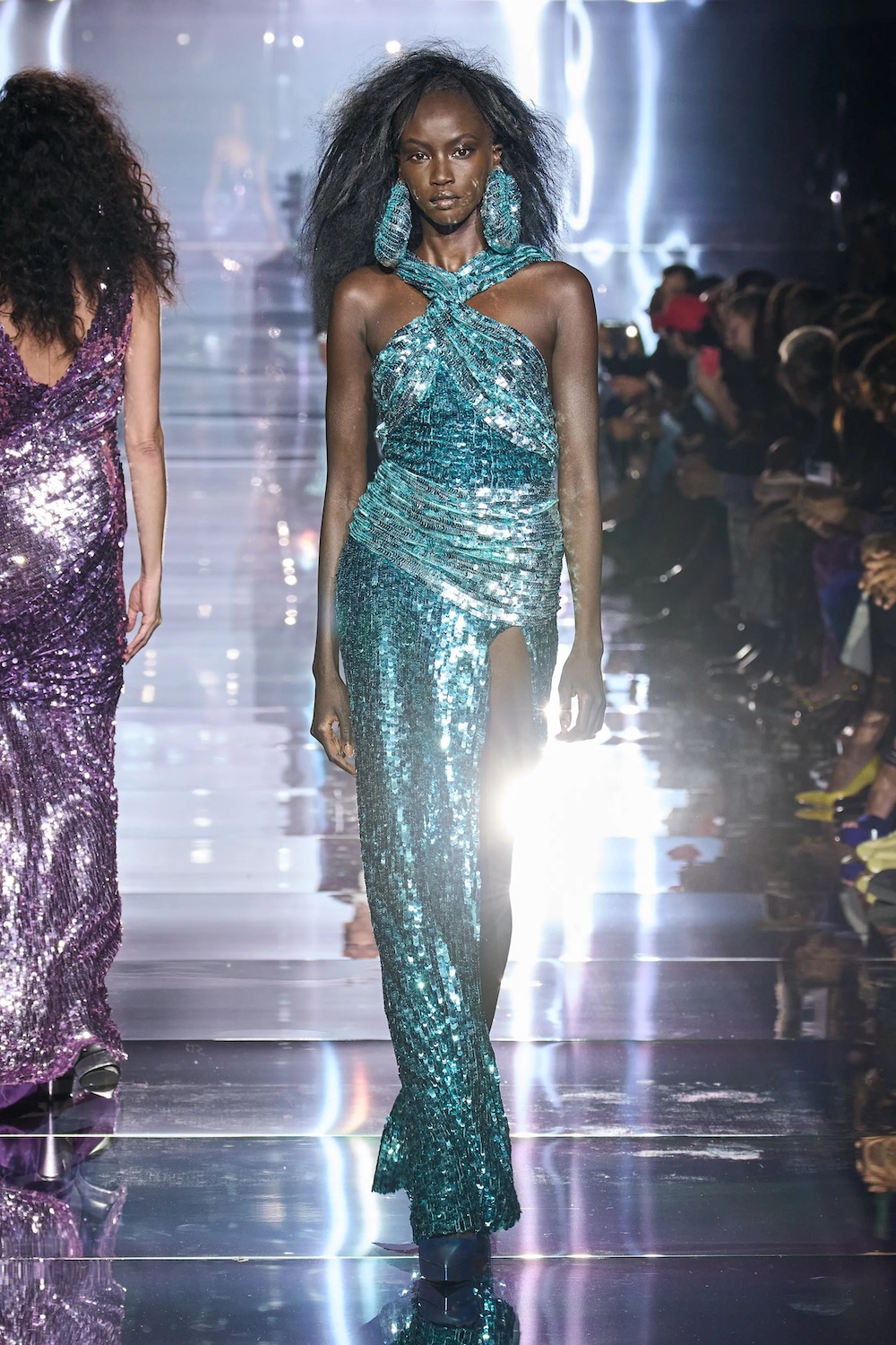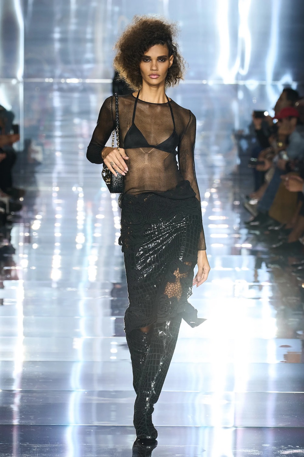 Tom Ford designs for the spotlight. Closing out a stellar NYFW season with the sort of star-studded panache that could’ve dressed the entire Studio 54 dancefloor, Ford was at his best, doing what he does best: concocting a wardrobe that’s fit for the brightest names in Hollywood. This season’s repertoire included teeny-weeny, sheer bras worn beneath glitzy blazers, shiny, belly-baring tracksuits, crinkly sports shorts and the sort of velvet hot pants you’d chuck on for a proper night out-out. Signature Ford suiting featured throughout, arriving in glittered leopard print and sugary pink variations, and came paired alongside underwear veiled by a curtain of black lace and satin shirts – a Ford favourite. Total glitz by the truck full. A procession of sequinned evening gowns with matching XXL hoop earrings closed out proceedings. Despite rumours swirling that Ford could be selling his business, this industry veteran has no intention of blending into the shadows.